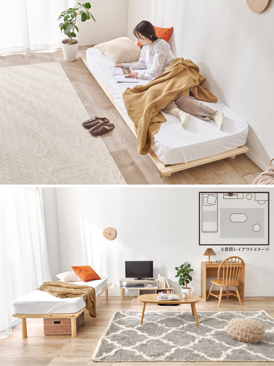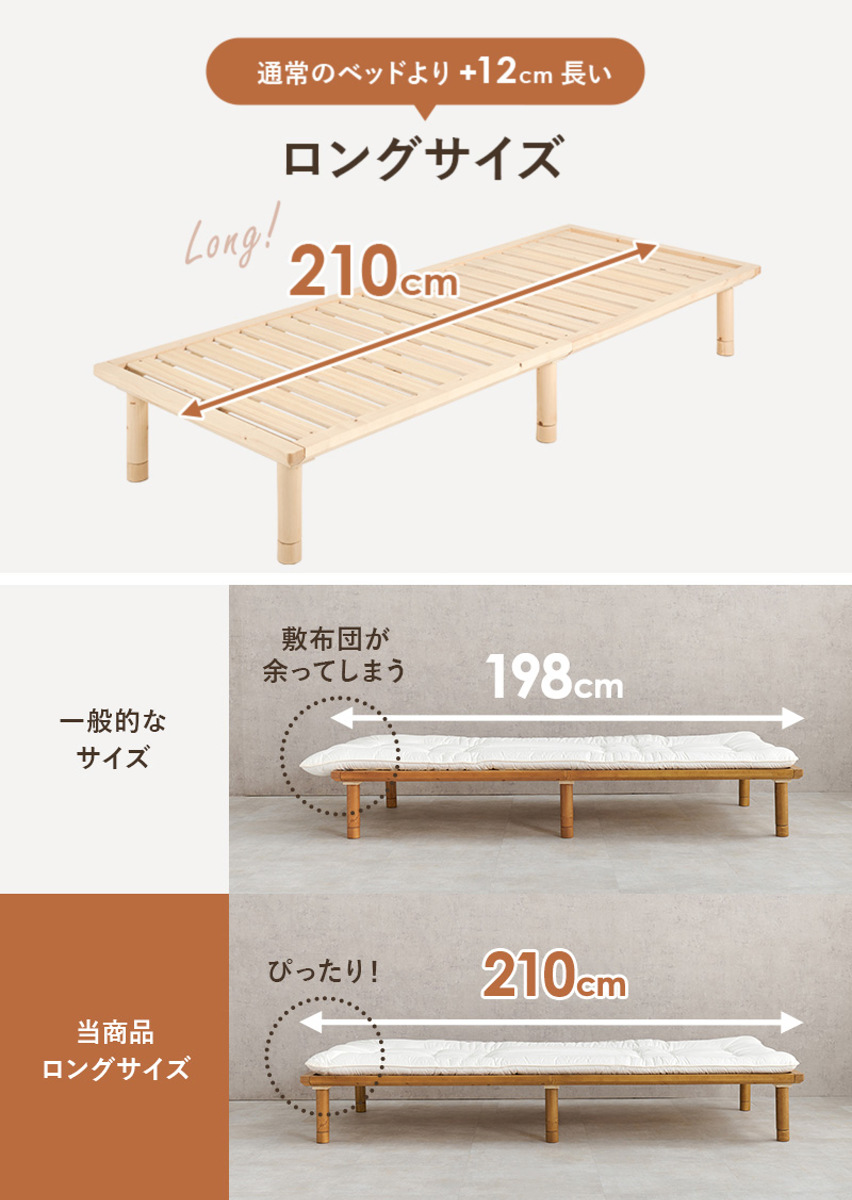 一般的なマットレスサイズに合わせたベッドが多い中、本製品は奥行を通常より約+12cm長く設計。敷布団もぴったり収まり、無駄なくお使いいただけます。高身長の方でも脚を伸ばして、ゆったり快適におやすみいただけます。
