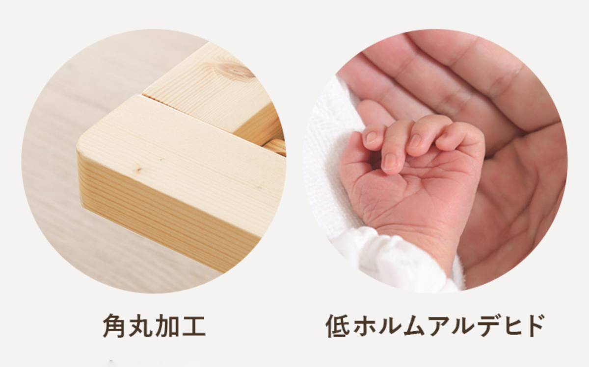 ベッドは面取り加工を施し、角を丸く仕上げたやさしいデザイン。ぶつかった際のケガにも配慮しています。使用している素材は、第三者機関の試験において低ホルムアルデヒドの最高等級「F★★★★」相当と認められたものを採用。小さなお子様がいるご家庭でも、安心してお使いいただけるようデザインと素材にこだわっています。