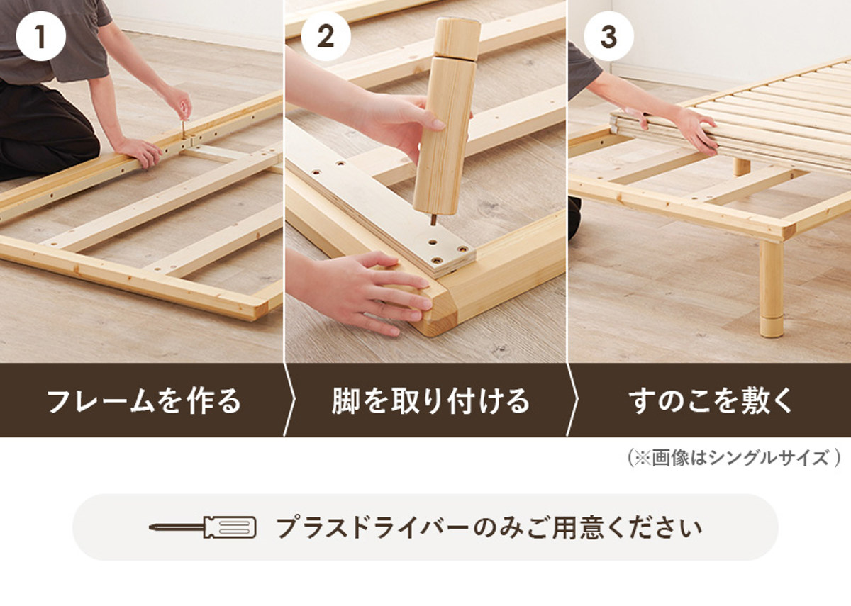 プラスドライバー1本で、3ステップの簡単組み立て。難しい工程がなく、届いてすぐにお使いいただけます。解体もスムーズに行えるため、引っ越し時にも便利です。