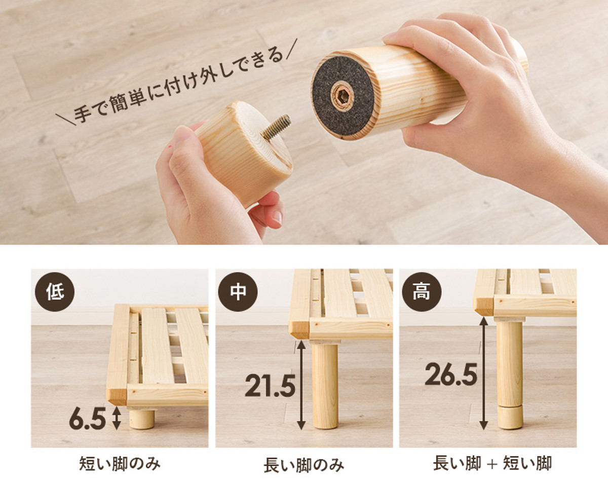 長さの異なる2種類の脚を組み合わせることで、3段階の高さ調節ができます。工具不要で簡単に付け外しができるため、ライフスタイルやお部屋に合わせて気軽に高さを変えてお使いいただけます。