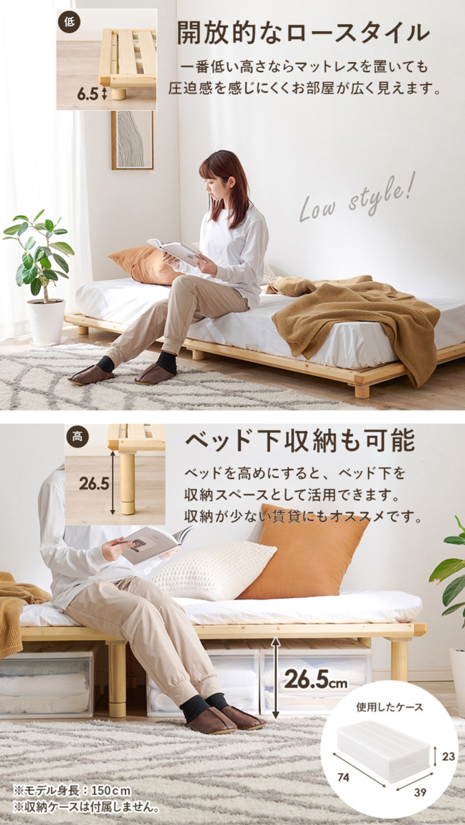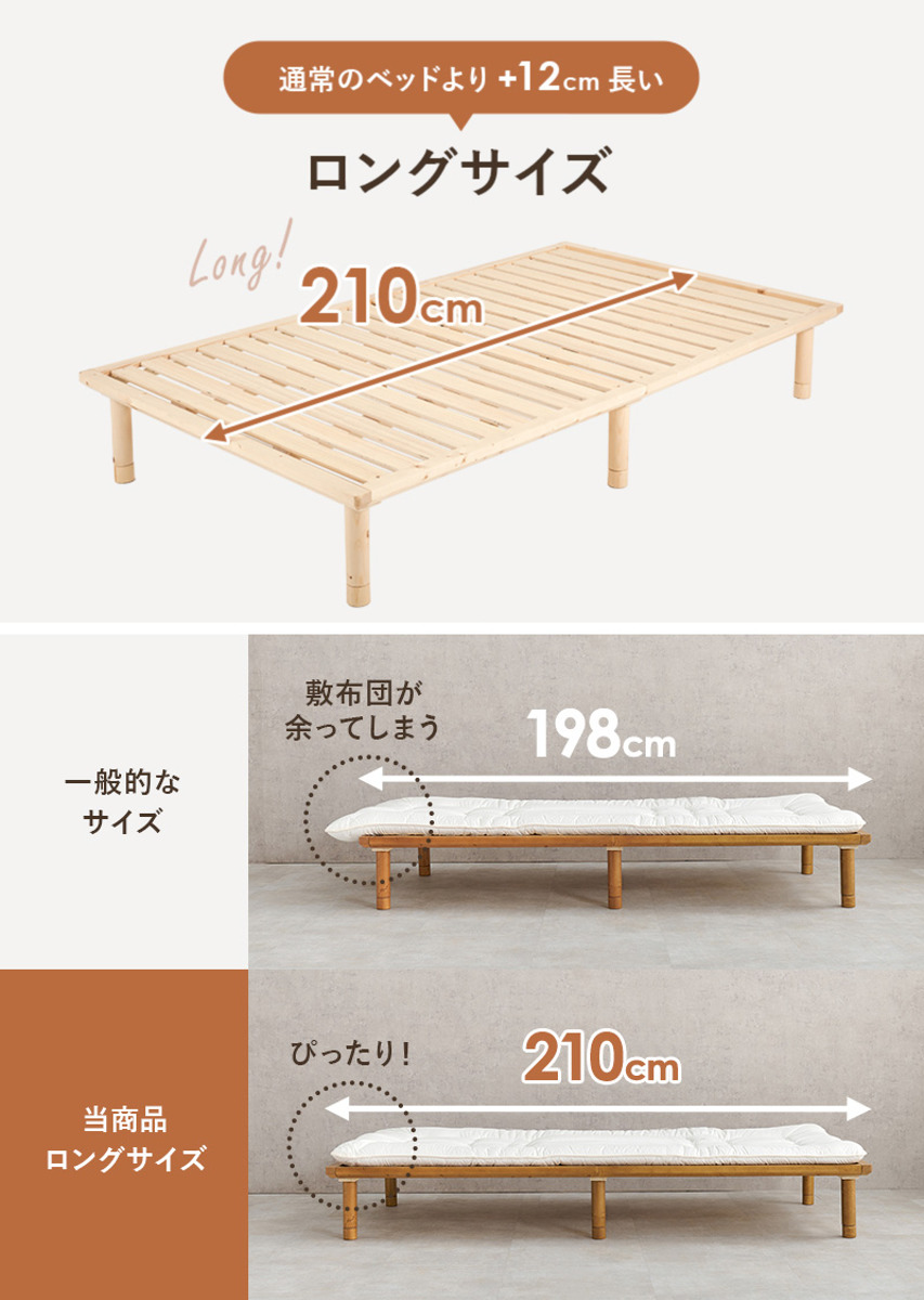 一般的なマットレスサイズに合わせたベッドが多い中、本製品は奥行を通常より約+12cm長く設計。敷布団もぴったり収まり、無駄なくお使いいただけます。高身長の方でも脚を伸ばして、ゆったり快適におやすみいただけます。