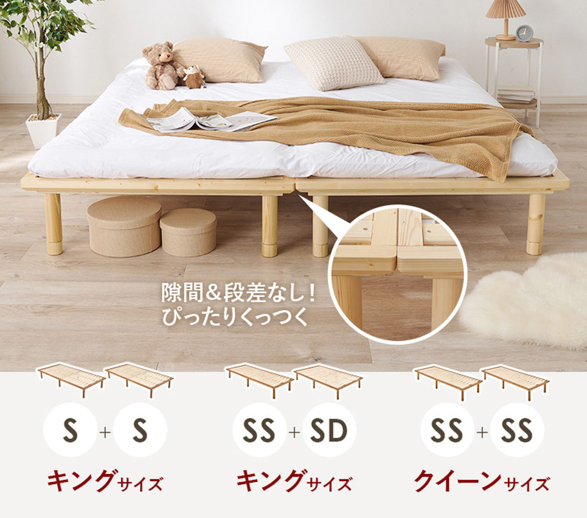 ベッド同士は隙間や段差なくぴったりとくっつけられるので、並べて一つの大きなベッドとしてお使いいただけます。奥行や高さはサイズ違いでも統一されているため、お部屋の広さや人数、ライフスタイルに合わせて自由に組み合わせが可能です。お子様の成長やライフスタイルの変化に合わせて分けて使えるため、長く使えて経済的です。