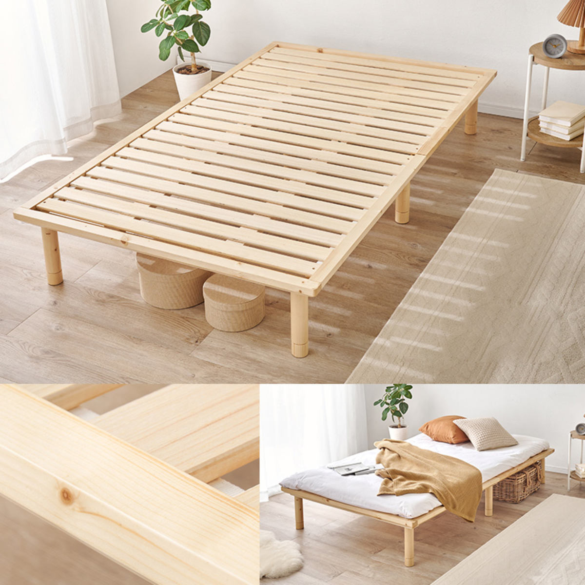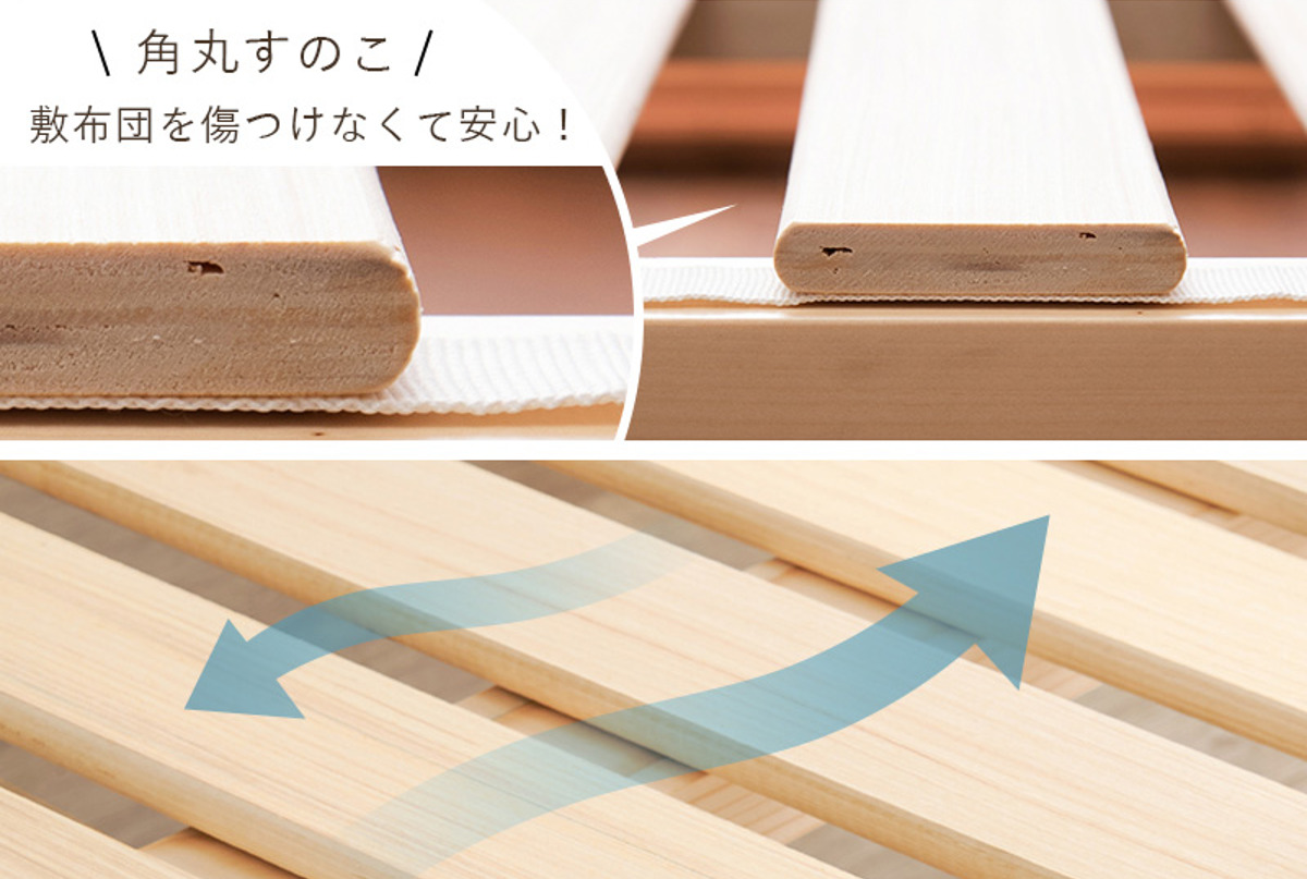 すのこの角は丸く面取り加工を施しており、布団をスライドさせても傷付きにくく、敷布団でも角当たりを感じにくい設計です。通気性にも優れているため、湿気を逃がして布団やマットレスを清潔に保ちます。敷布団派の方にも安心して使えるやさしい設計です。