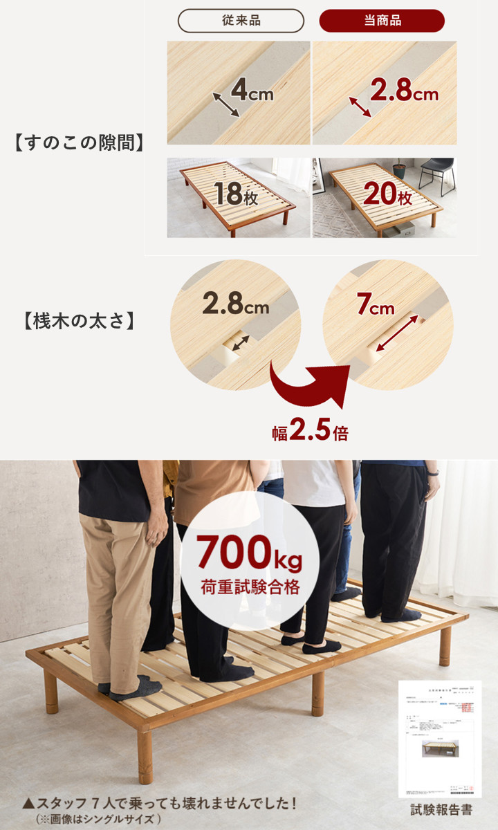 すのこの間隔を従来品より狭く設計することで枚数を増やし、より安定感のある構造に仕上げました。さらに、すのこを支える桟木(さんぎ)も従来品の約2.5倍の太さに強化し、上からの荷重にも強い設計です。細部までこだわった構造により、第三者機関による約700kgの荷重試験をクリア。きしみにくく、体格の大きい方でも安心してお使いいただけます。
