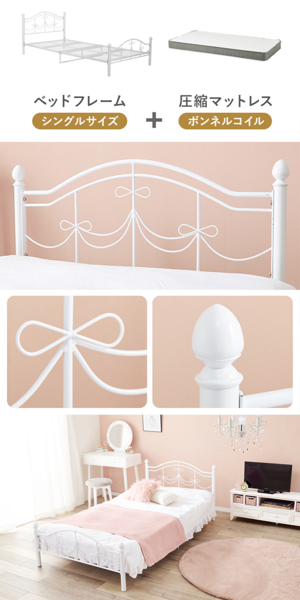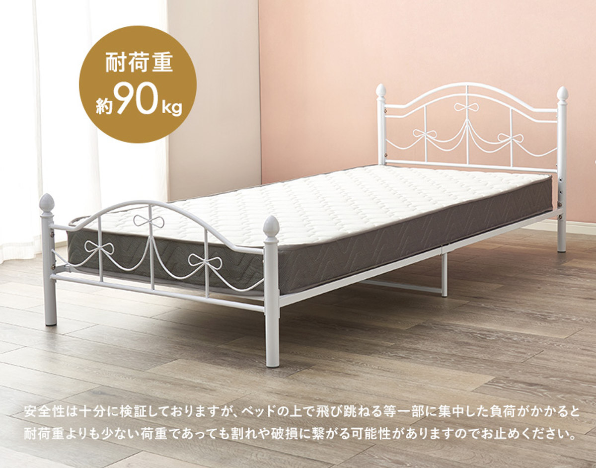 リボン装飾が大人可愛いマットレス付きスチールベッド