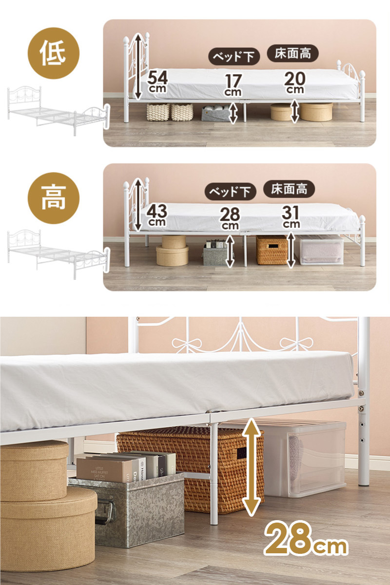 お部屋の広さやお好みに合わせて、床面の高さを2段階で調節できます。高い位置に設定すると、ベッド下は約28cmの収納スペースとして活用可能。高さのある物もすっきり収まり、限られた空間を有効に使えます。収納スペースが取りにくいお部屋や、一人暮らしのワンルームにもおすすめです。