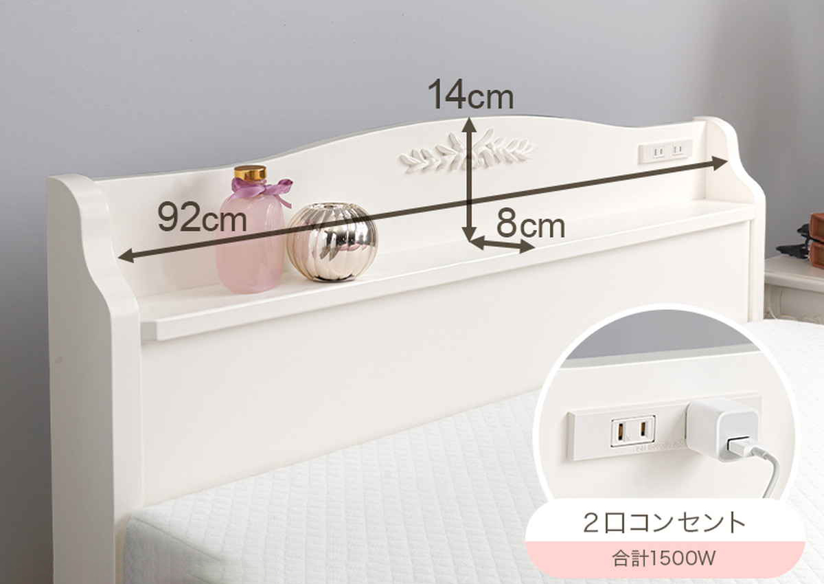 2口コンセントを備えているため、スマホを充電しながら照明や加湿器なども同時に使用できます。ヘッドボードには時計や小物も置けて、使い勝手の良い設計です。