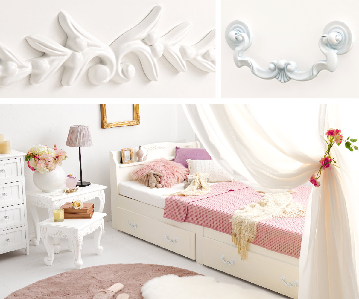 クラシカルなモチーフが魅力の、上品な宮棚と便利な引き出しが付いたすのこベッドです。ネジや工具は不要で、パーツを差し込むだけの簡単設計です。組み立てが苦手な方でも、わずか約3分で完成します。