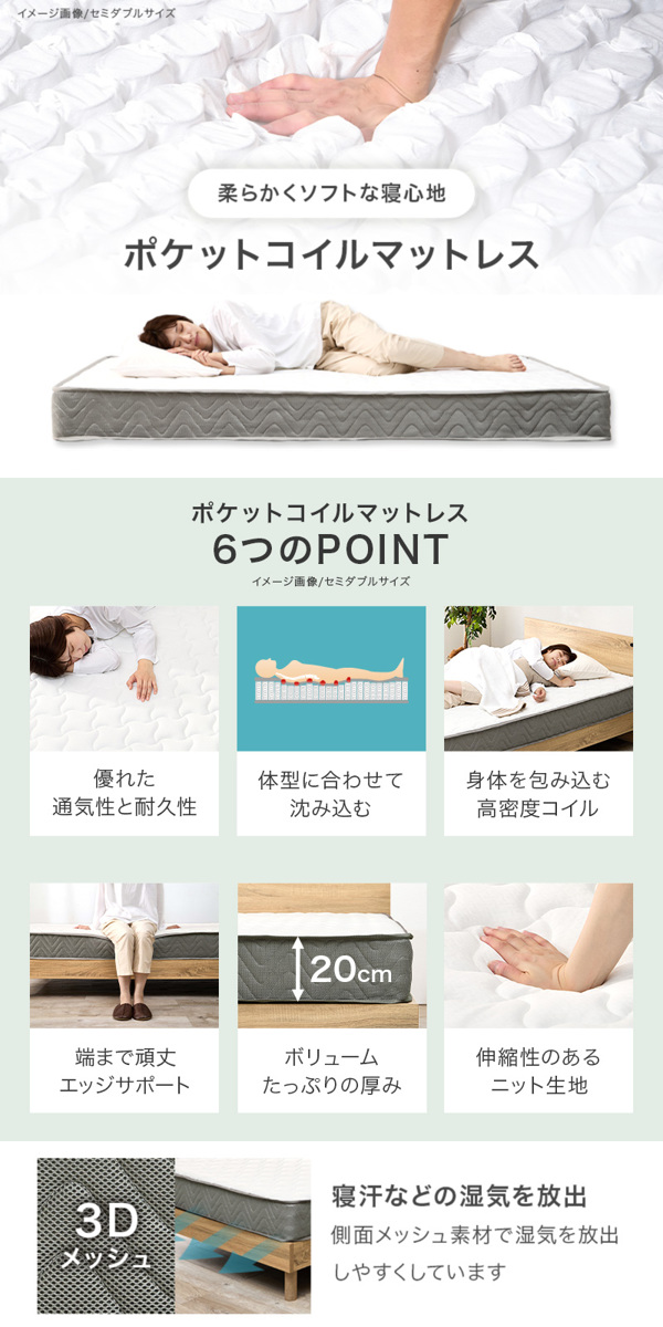 寝姿勢の凹凸に沿って沈み込むポケットコイルマットレスです。マットレス内部の通気性が良く、耐久性が高いのも特徴です。表面の伸縮性に優れたニット生地が寝返りのときも体に優しくフィットします。