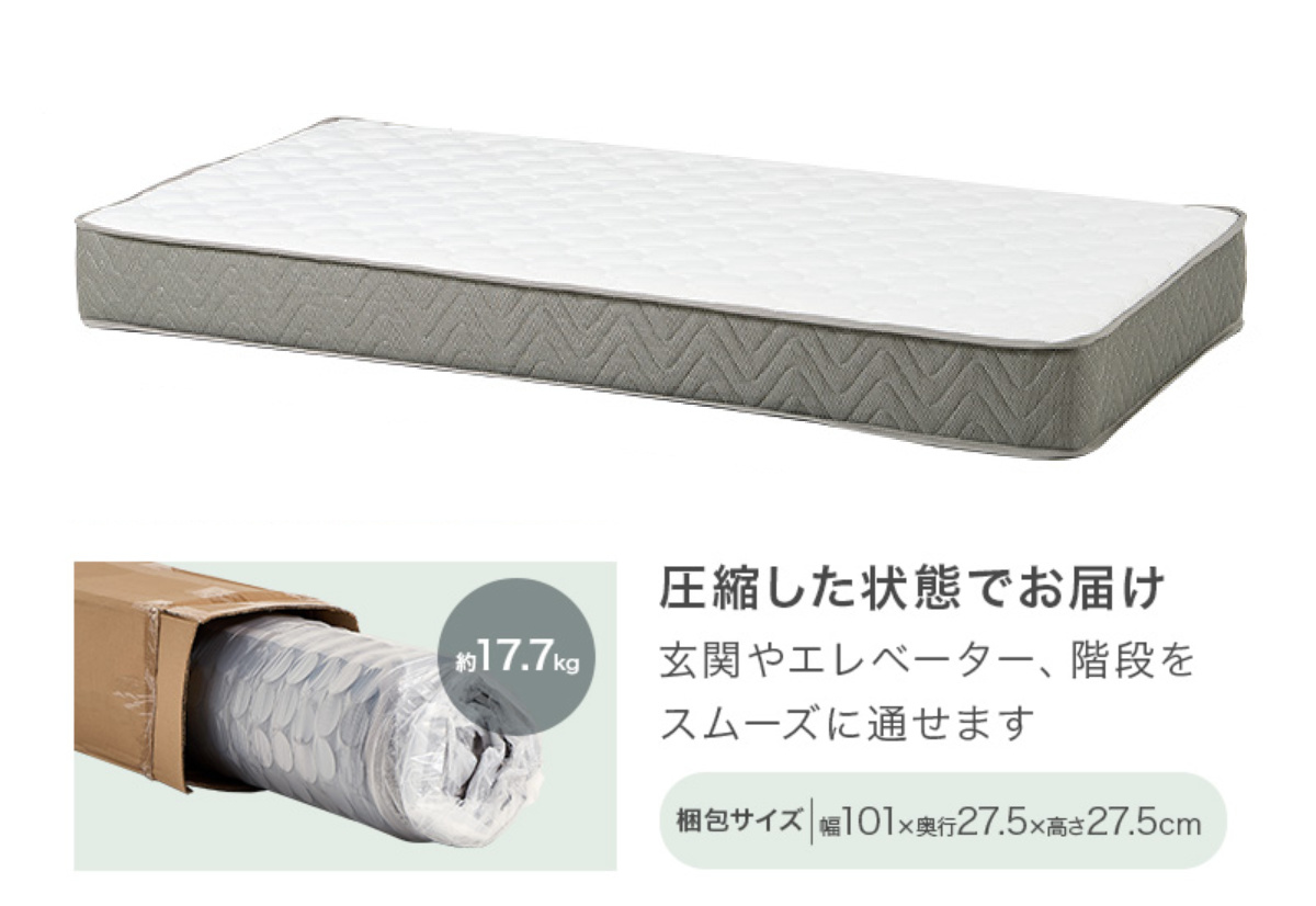 マットレスは、ロール状のコンパクトな圧縮梱包でのお届けです。大きなマットレスはベッドまでの移動が大変ですが、玄関やエレベーター、階段をスムーズに通せます。簡単に、安心して搬入・設置をしていただけます。お部屋のスペースが限られている方にもおすすめです。