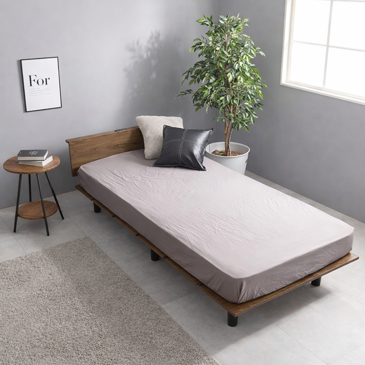 ステージベッドのようなベッドフレームと、ポケットコイルマットレスのセットです。シンプルな木目調のパネルに黒い脚がスタイリッシュなデザインで、お部屋をすっきりとした印象にしてくれます。