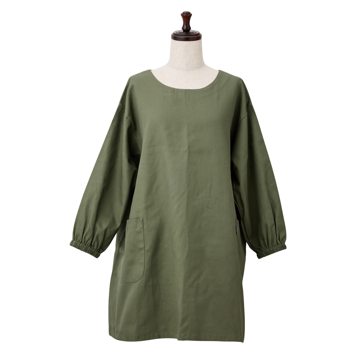 上半身から膝丈まで覆うデザインで、袖口だけでなく服全体を汚れから守ります。ゆとりのあるシルエットで動きやすく、家事や作業も快適に行えます。