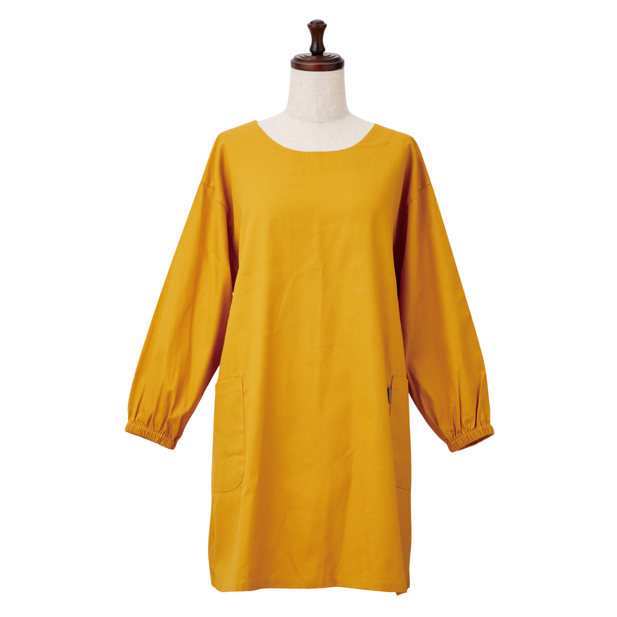 上半身から膝丈まで覆うデザインで、袖口だけでなく服全体を汚れから守ります。ゆとりのあるシルエットで動きやすく、家事や作業も快適に行えます。