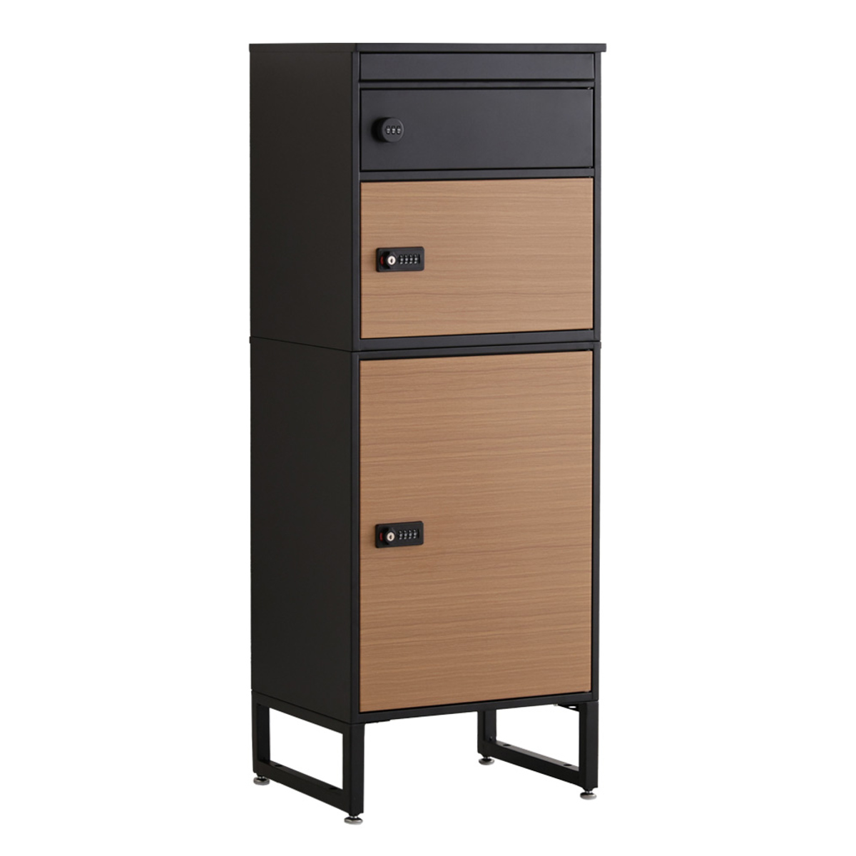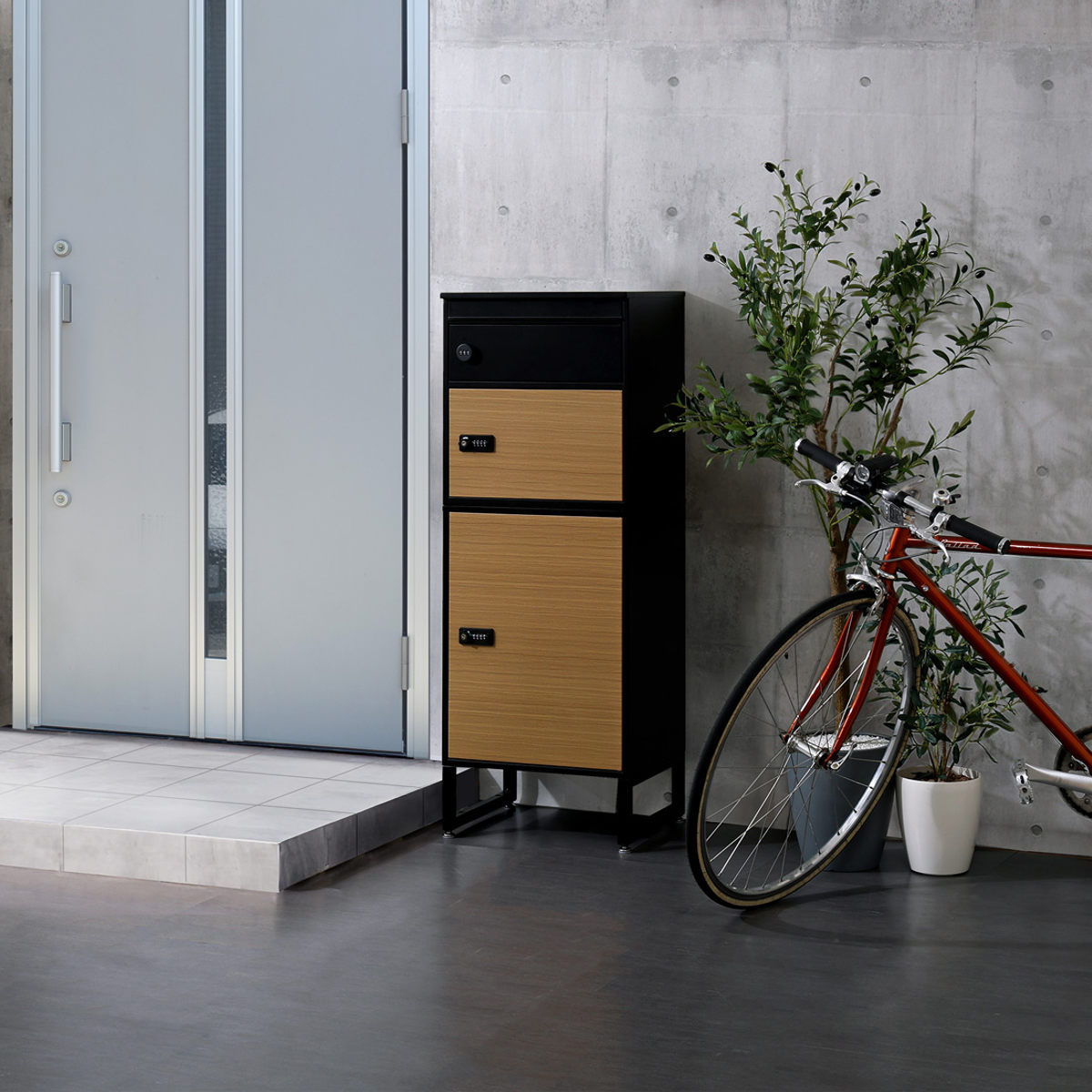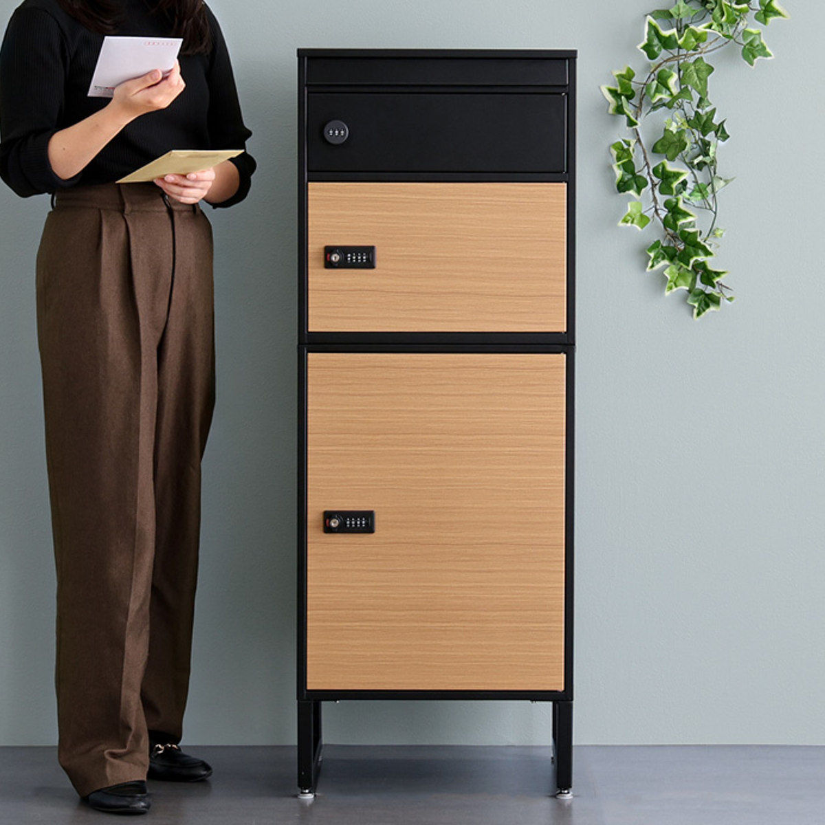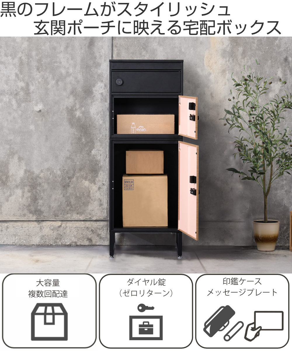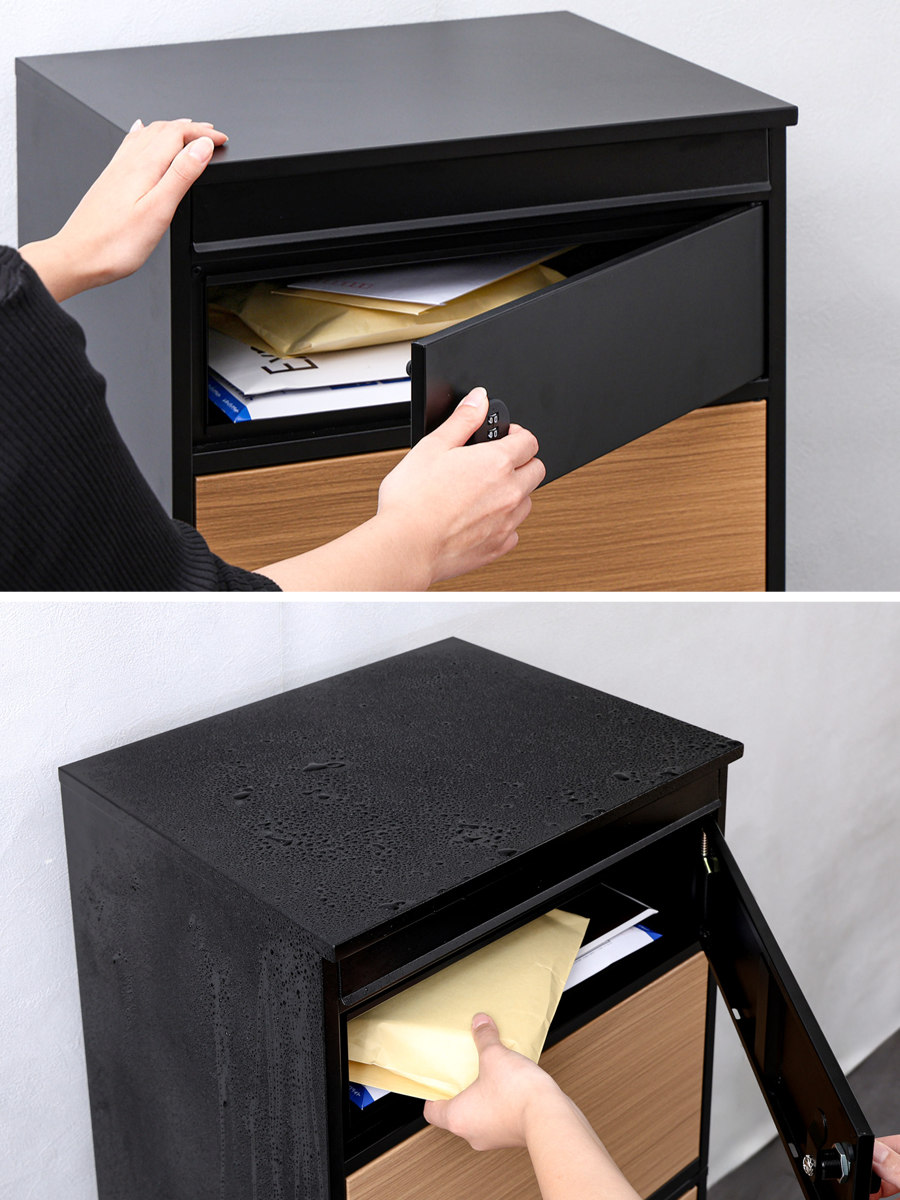 引き締まった黒のフレームがスタイリッシュな印象の宅配ボックスです。扉のオーク柄が美しいアクセントになっています。