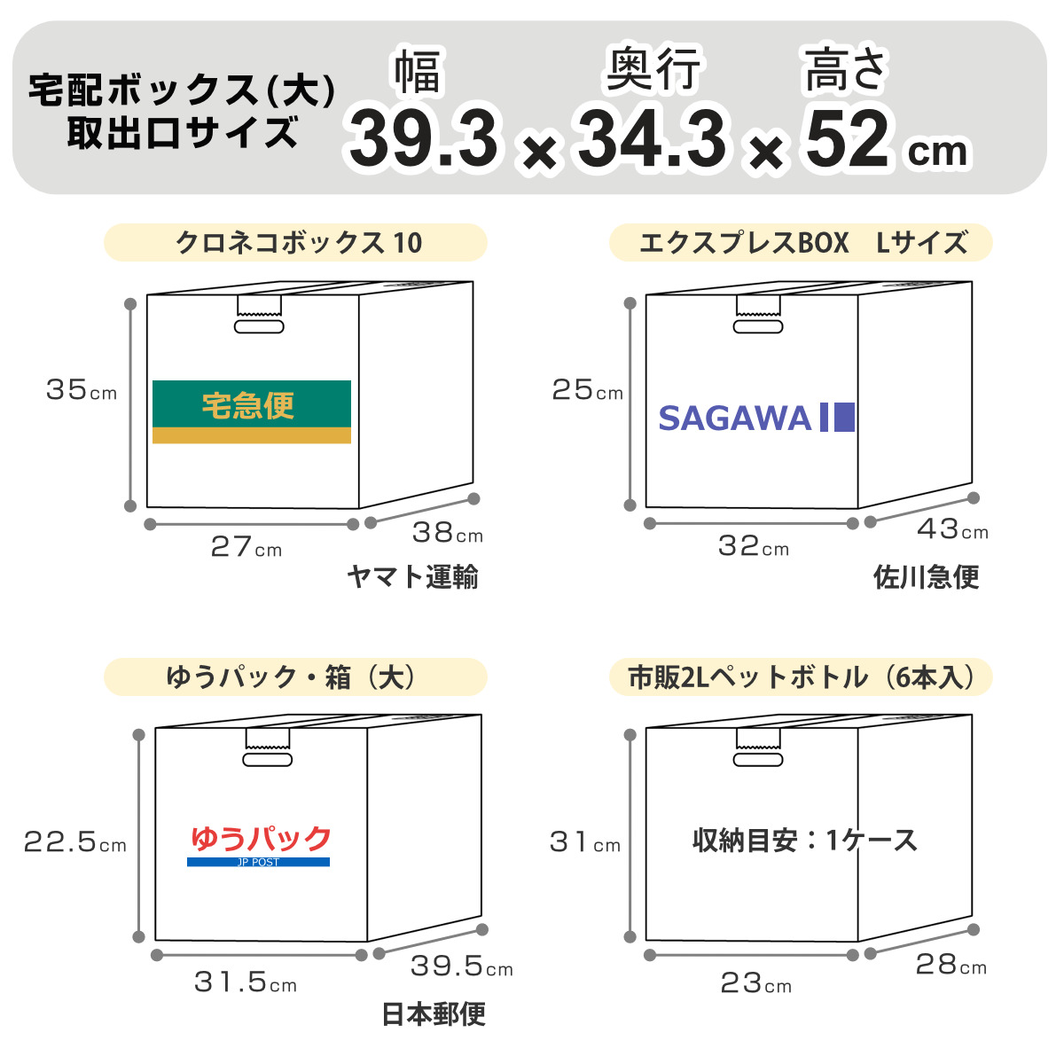 宅配ボックス(大)には100サイズの荷物が受け取り可能です。収納目安としては、2Lのペットボトル×6本入りが入ってもまだ余裕の広さです。