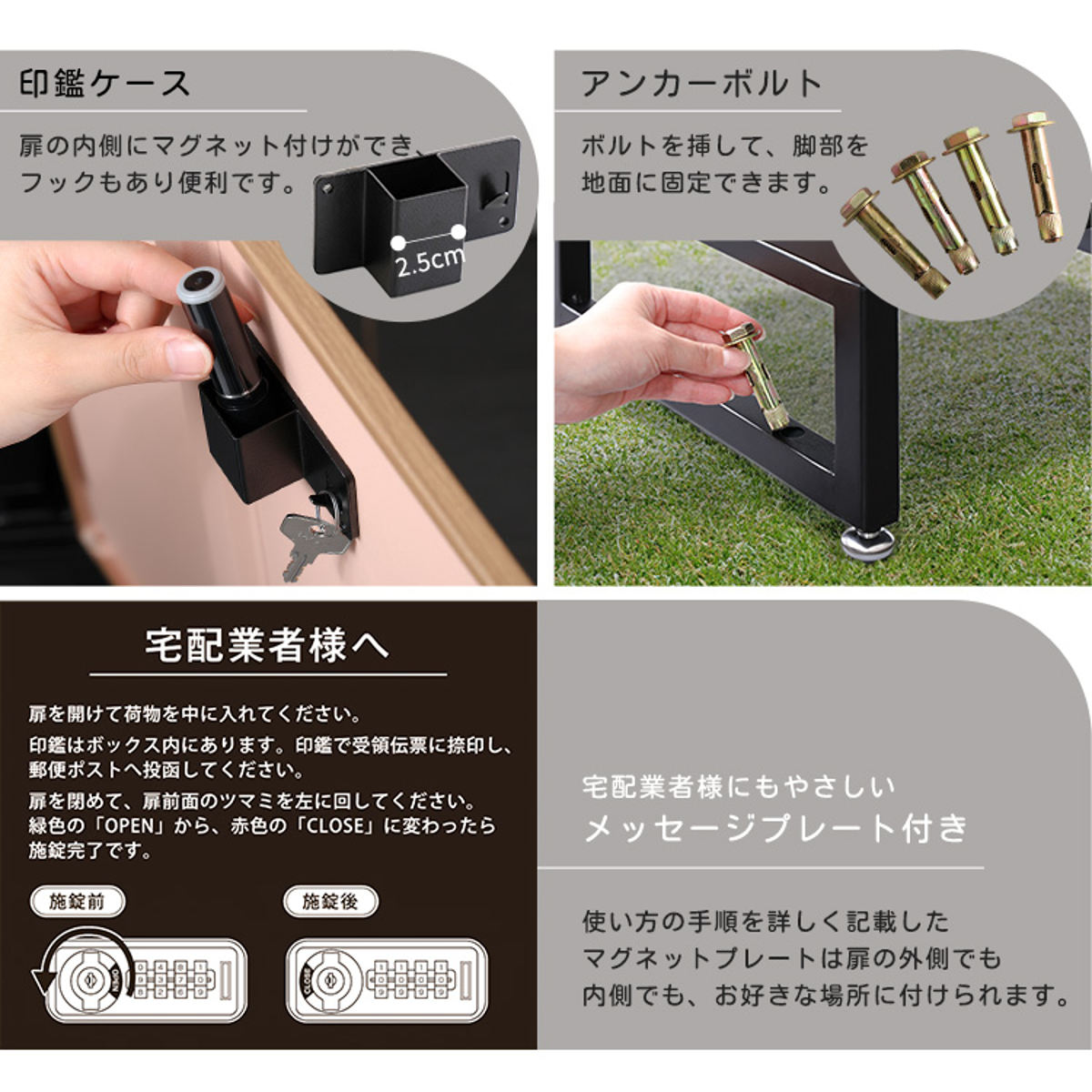 荷物の受け渡しをスムーズにする付属品をお付けしています。万が一の盗難に備えた装備も揃えました。マグネット式の印鑑ケースは2個付属しています。