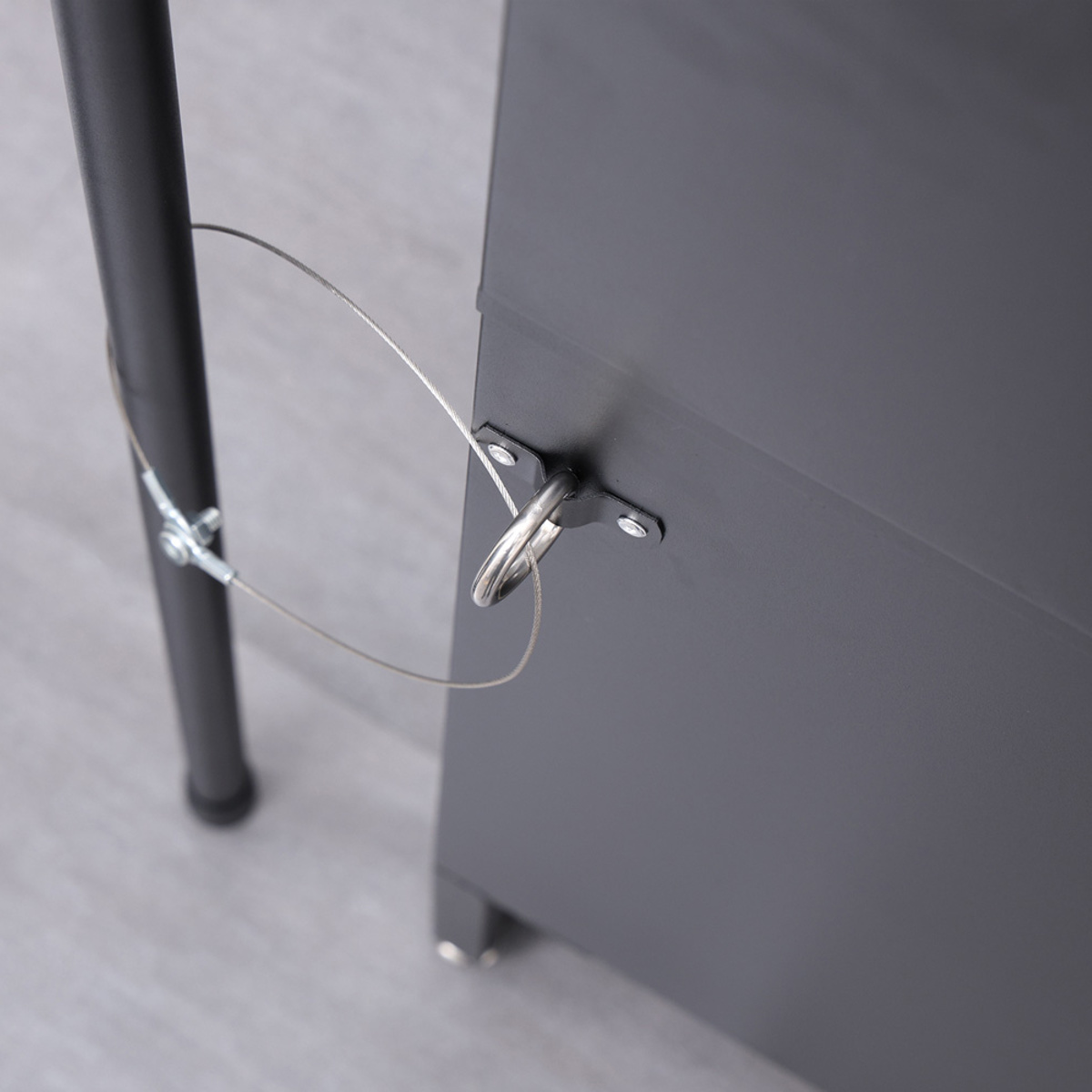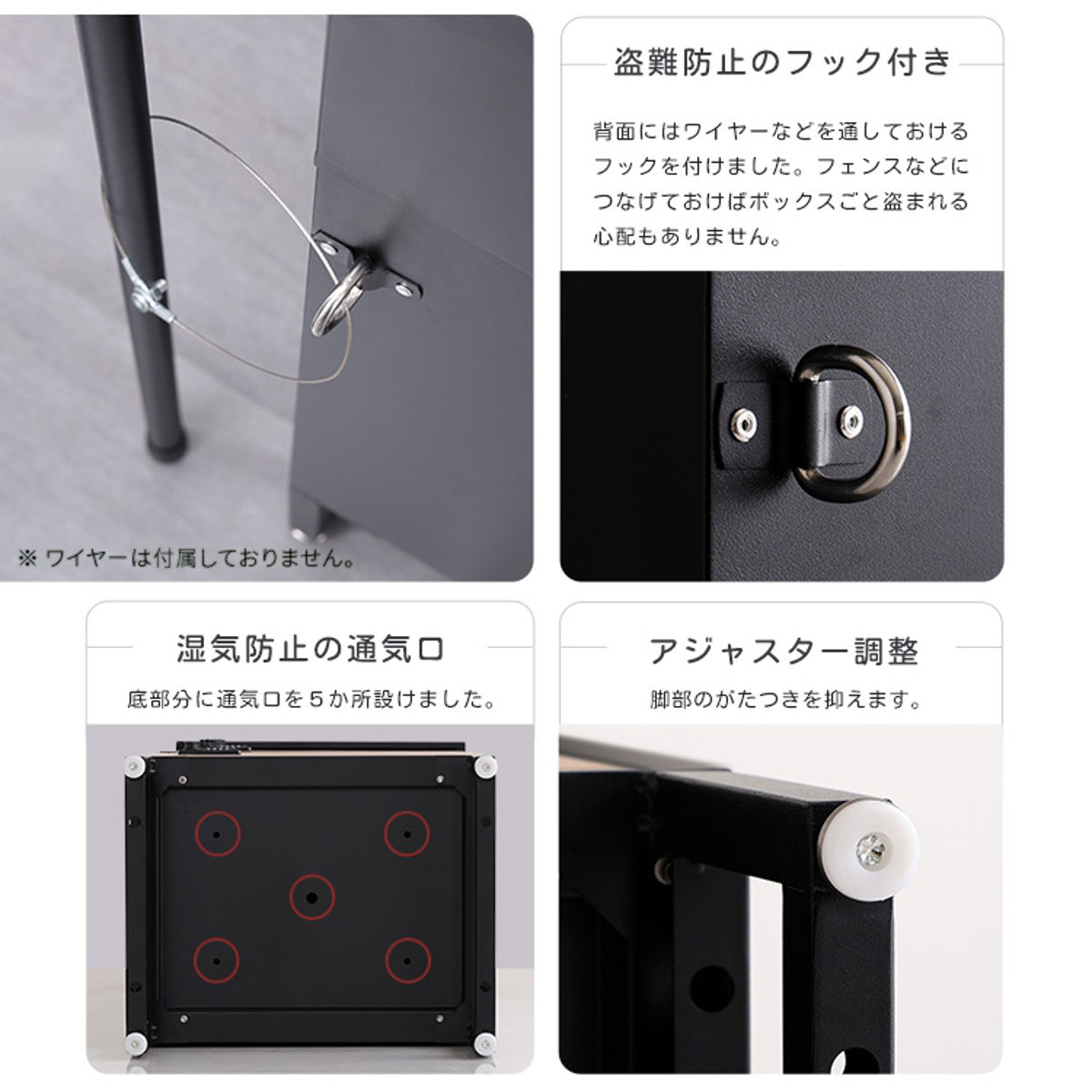 背面にはワイヤーなどを通しておけるフックを付けました。フェンスなどにつなげておけばボックスごと盗まれる心配もありません。