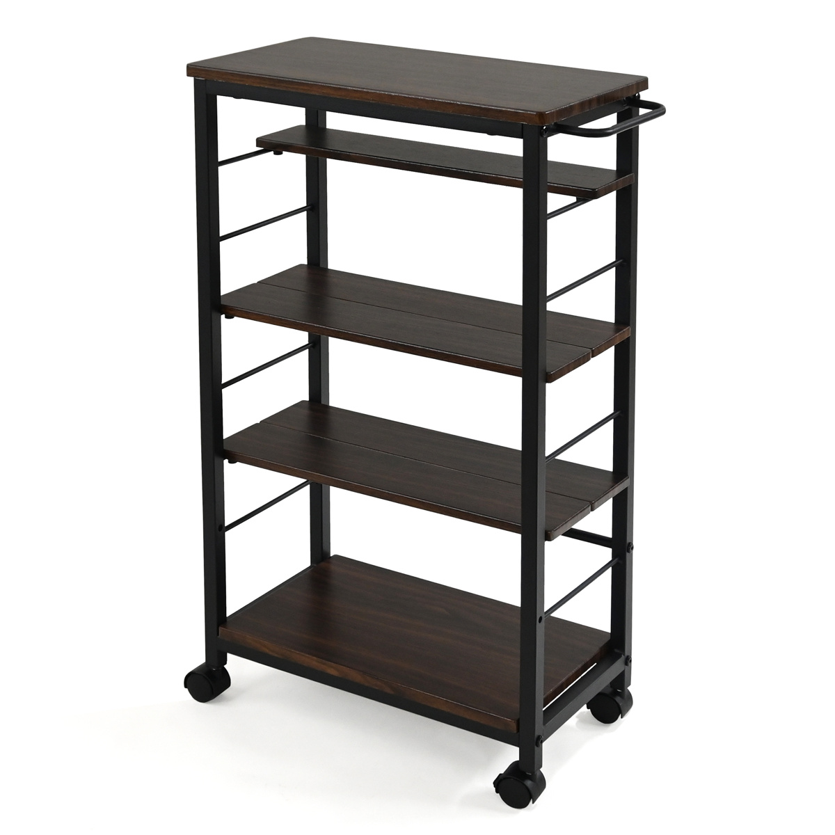 キッチンのちょっとしたすき間にもすっきり収まる、幅25.5cmのスリムなキッチンワゴンです。限られたスペースを有効活用しながら、調味料や食器、保存食品などをまとめて収納できます。置き場所に困りがちな小物類もすっきり整理でき、キッチンまわりを整った印象に見せます。