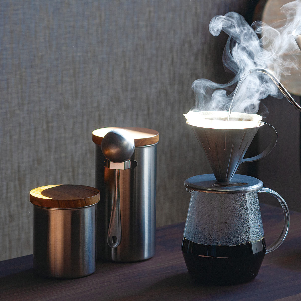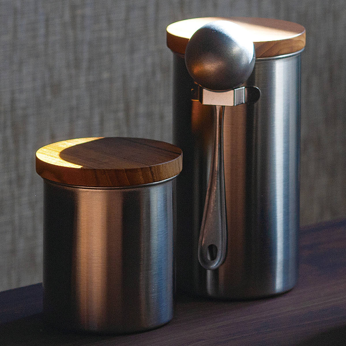 シンプルで美しいステンレス製のコーヒーキャニスターです。遮断性・密封性のある本体は外気や湿気を遮断し、食品の鮮度と香りを長く保つ効果があります。