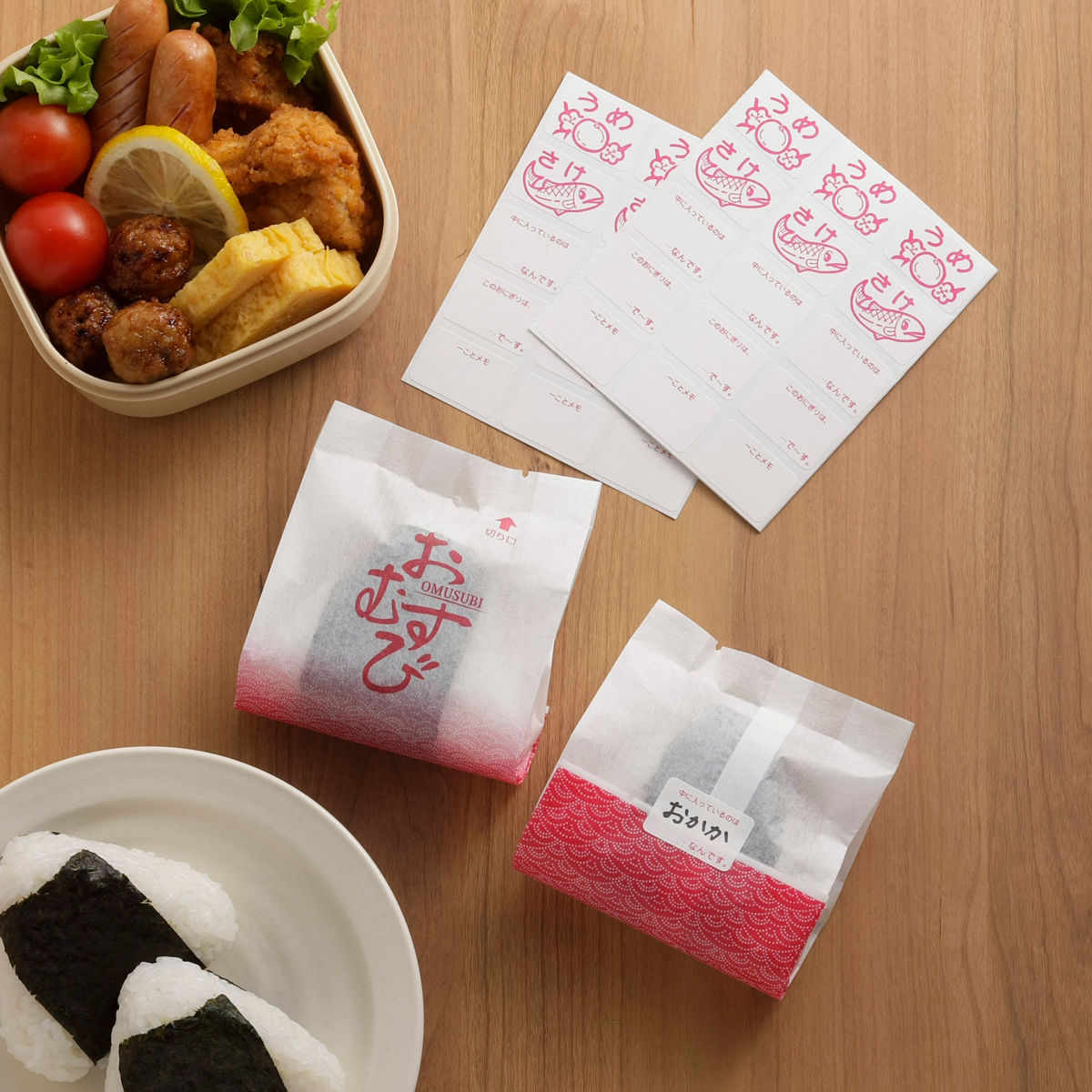 おにぎりを入れた袋の口を止めるシールには、おにぎりの具を書き込むことができるので、中身がひと目でわかります。