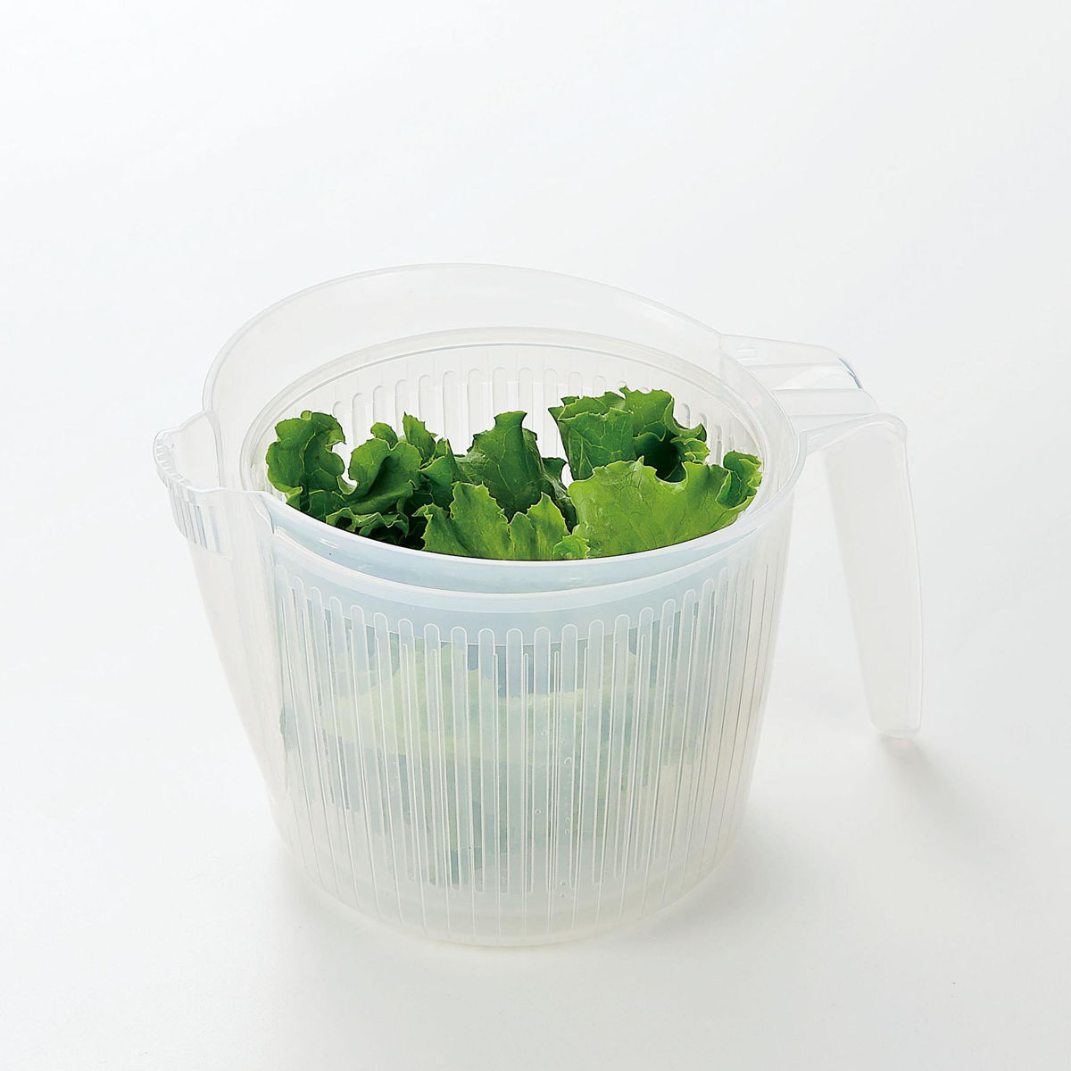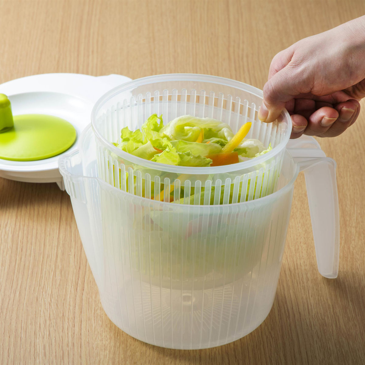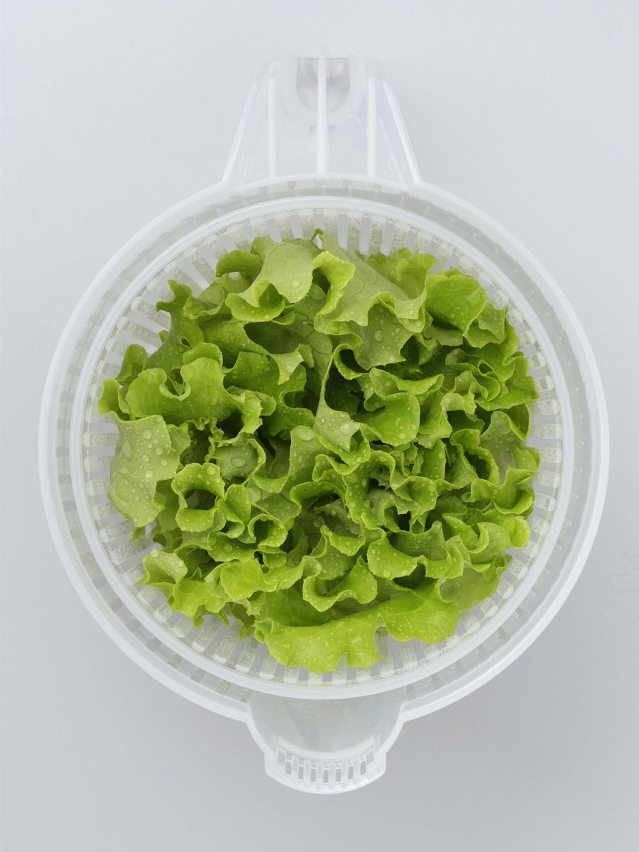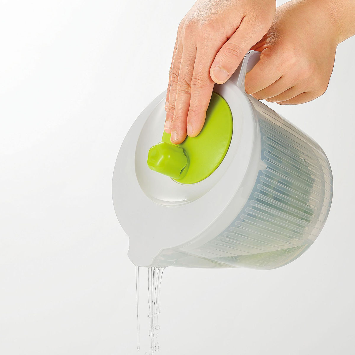 野菜の水気をしっかり切れるサラダスピナーです。遠心力で水分を外側に飛ばし、ザルよりもしっかり水を切ることができます。ドレッシングもよくからみ、おいしいサラダが味わえます。