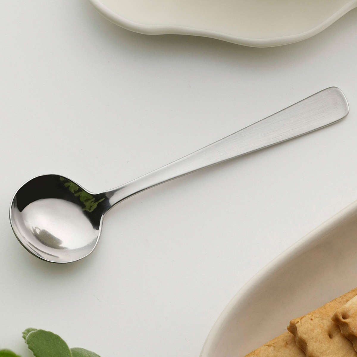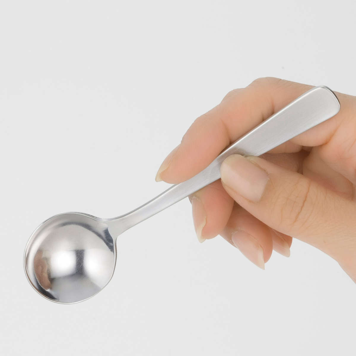 柄の部分はつや消し加工で、指紋や汚れが目立ちにくい実用的な仕様です。丸いスプーン部分はミラー仕上げで、汚れが落としやすくお手入れも簡単です。