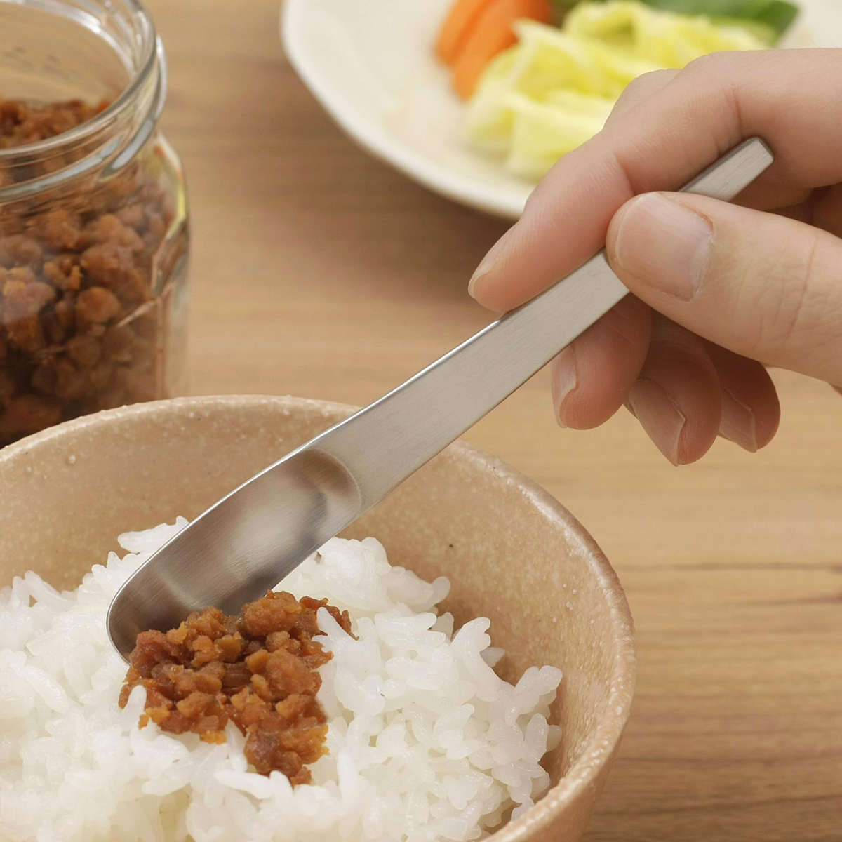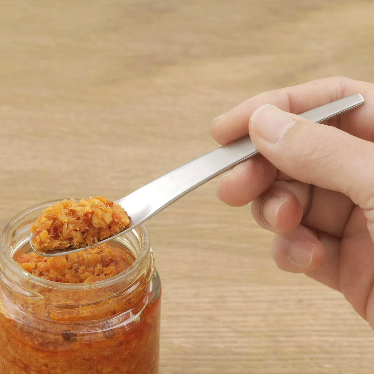 小さな瓶から食材をすくいやすいスリム形状の「ご飯のお供スプーン」です。幅が細く小瓶の口にもスッと入り、ジャムや調味料、ディップなども瓶の底まできれいにすくえます。