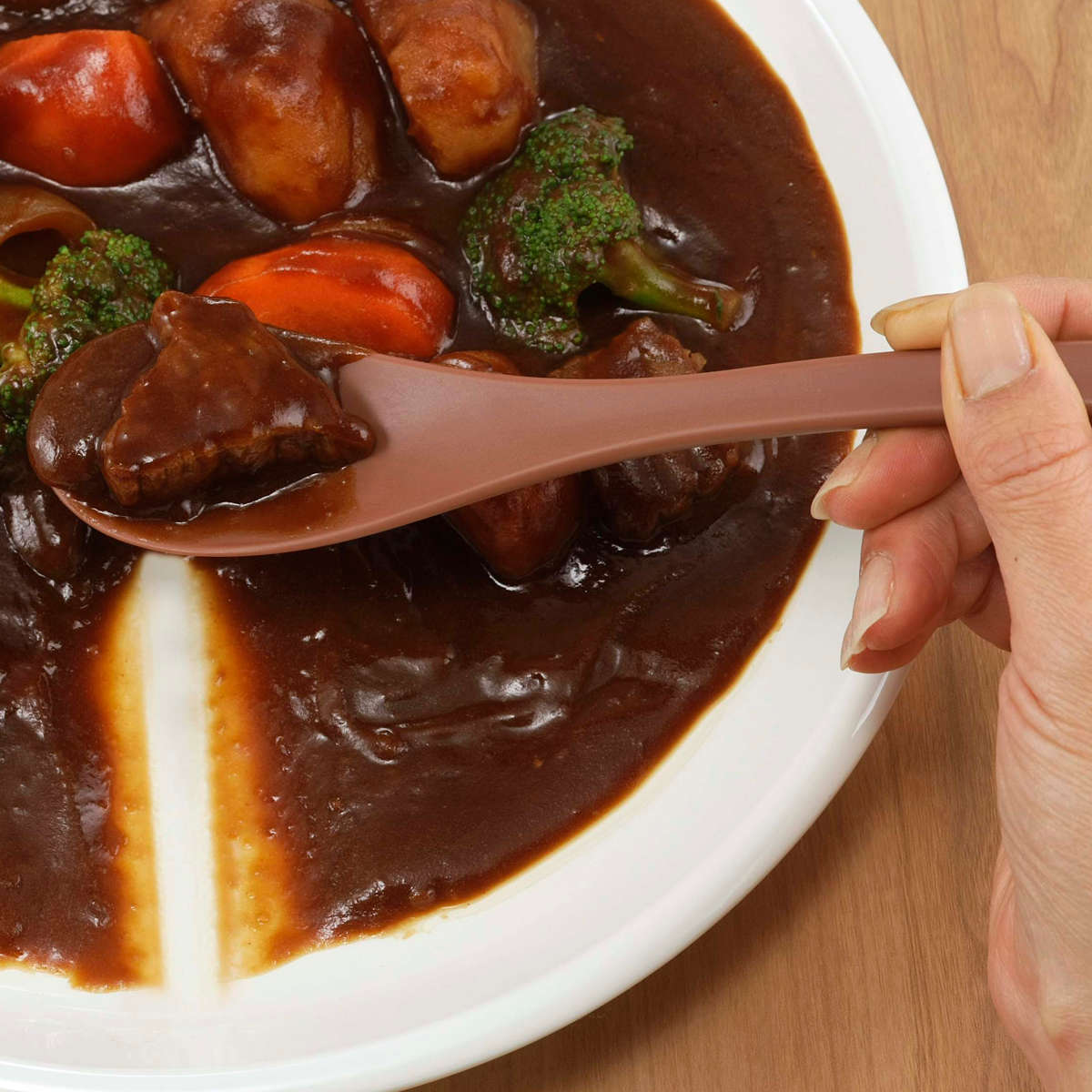 お皿のカーブにしっかりフィットする形状で、料理をキレイに寄せられるスプーンです。すくいやすさと扱いやすさを両立しており、最後まで気持ちよく食べられます。