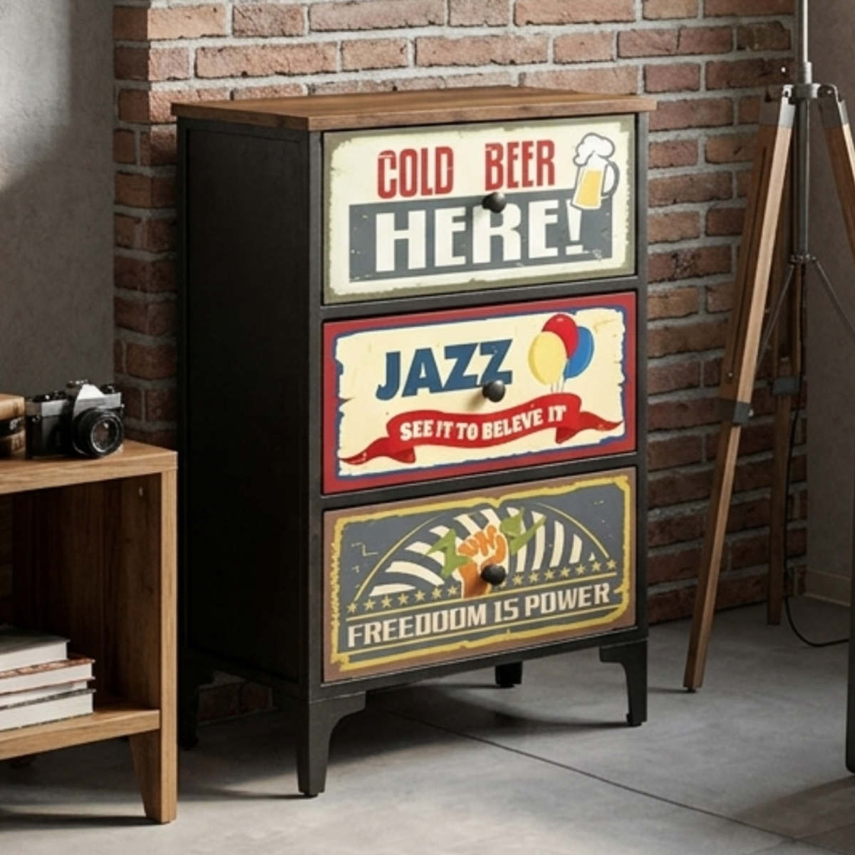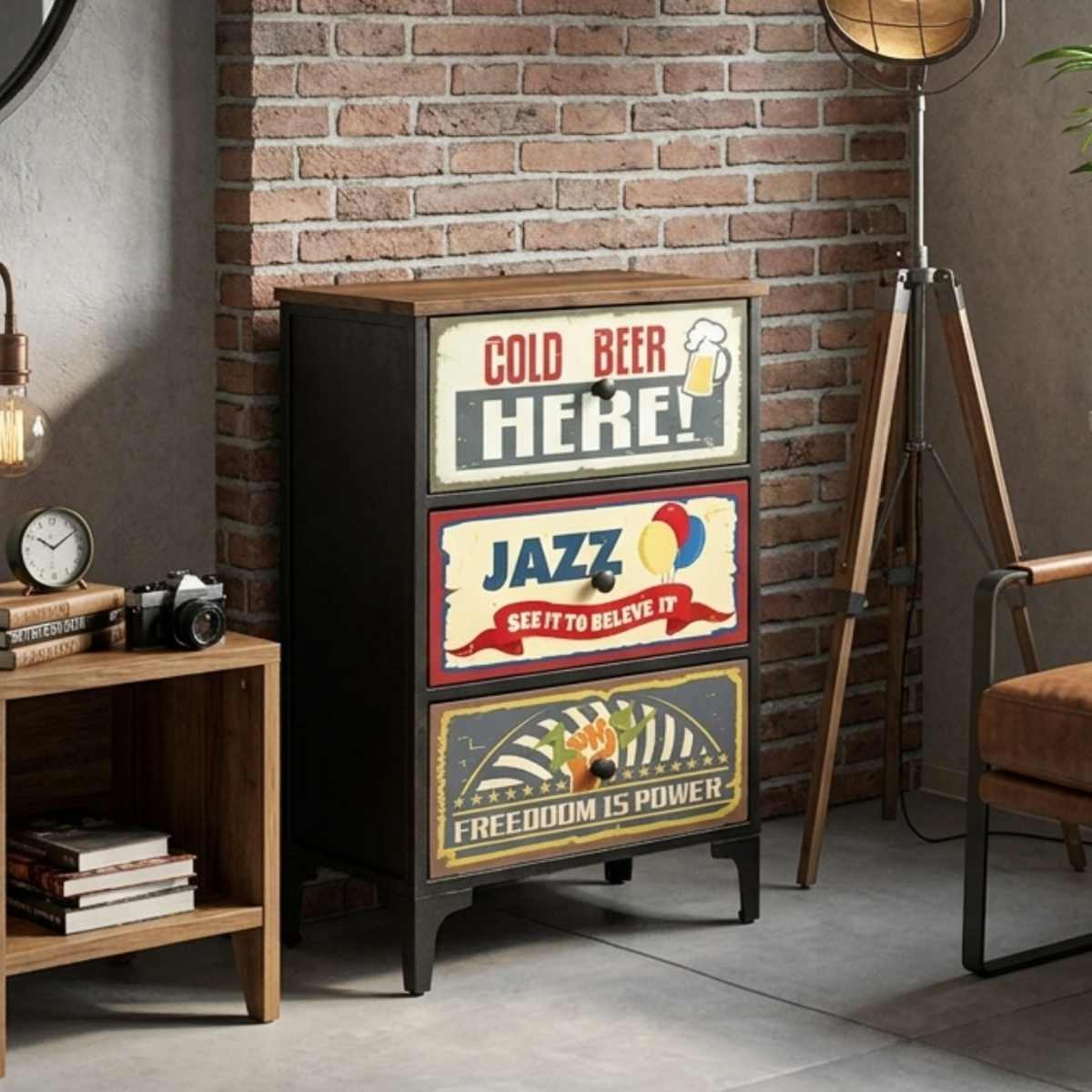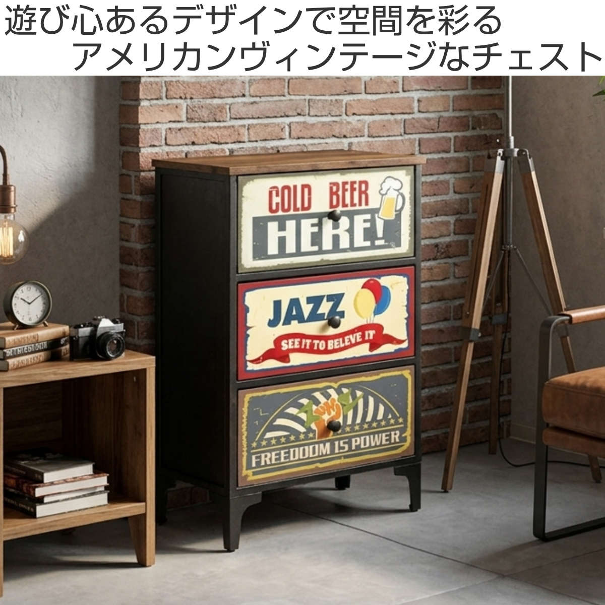 ヴィンテージ感のあるデザインが魅力の3段チェストです。置くだけで空間にこなれた雰囲気をプラスし、お部屋のアクセントとしても活躍します。