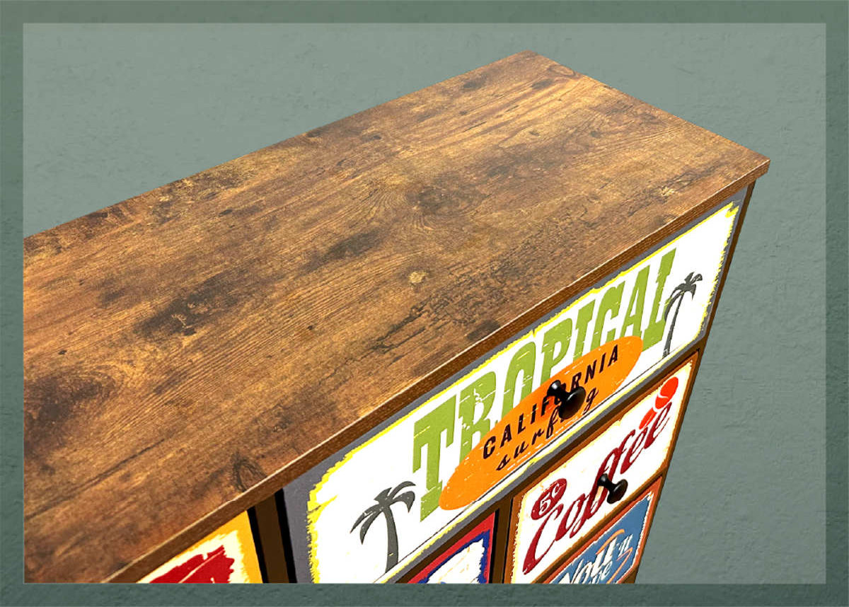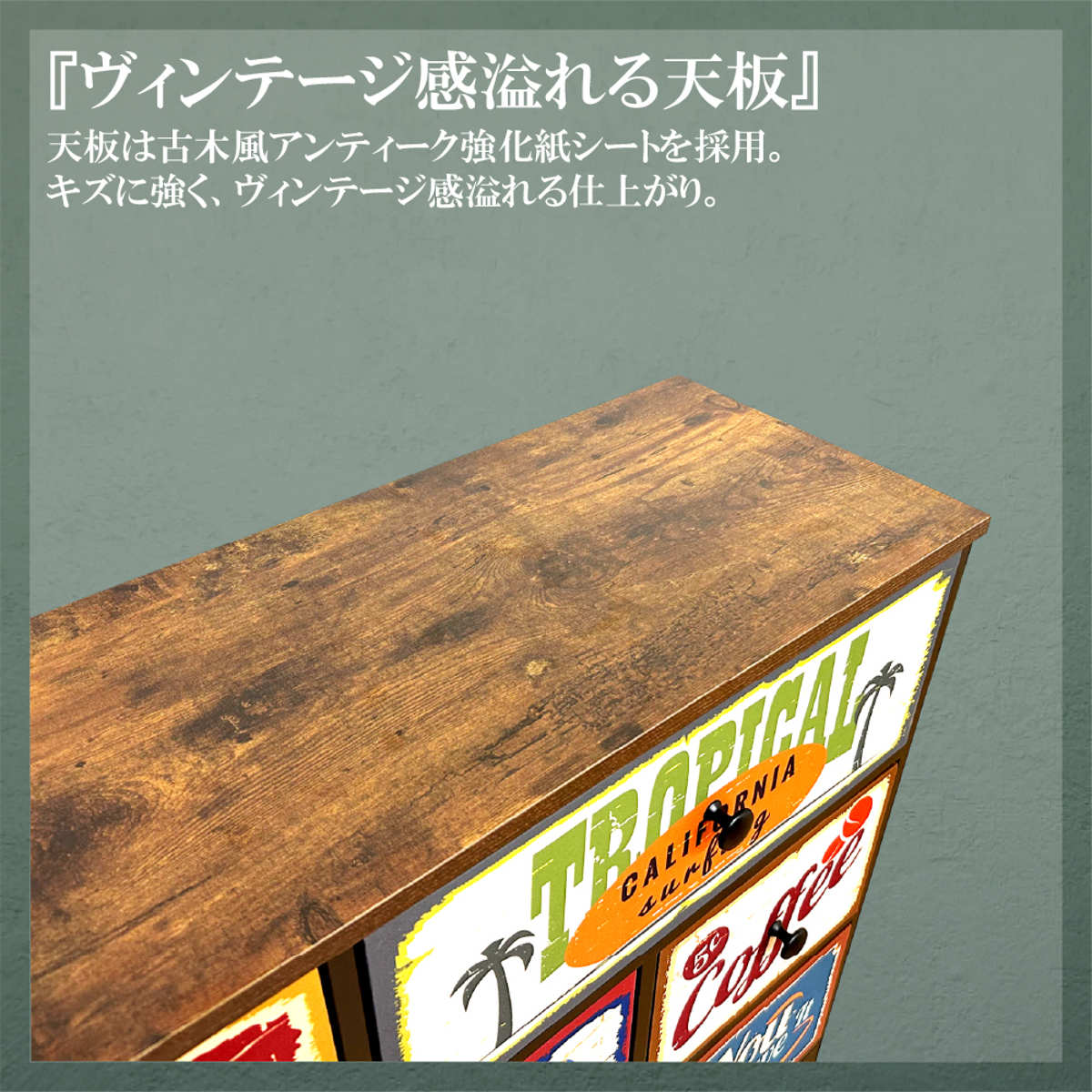 天板には古木風のアンティーク調強化紙シートを使用しています。傷に強く、味わいのある風合いでお部屋にヴィンテージ感をプラスします。