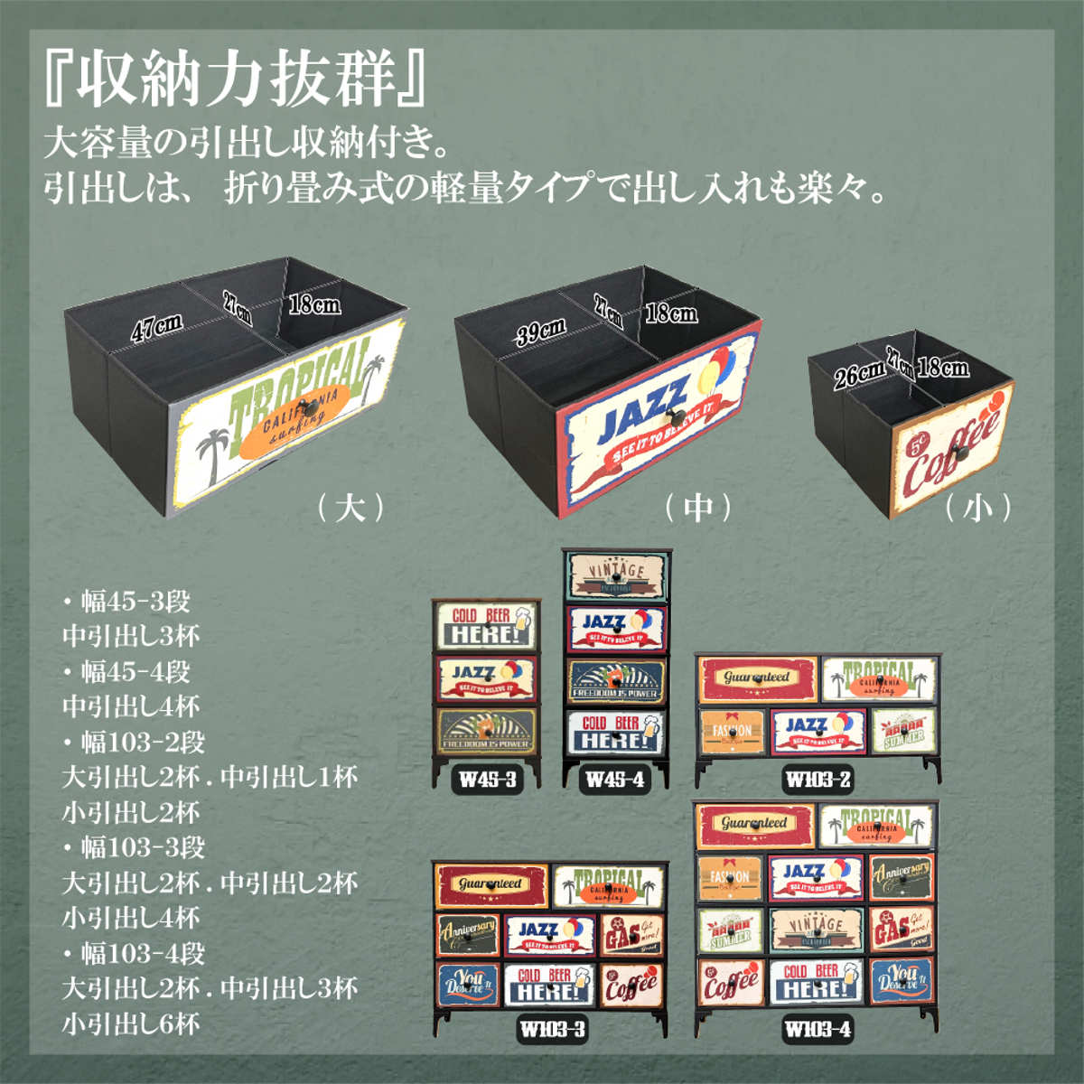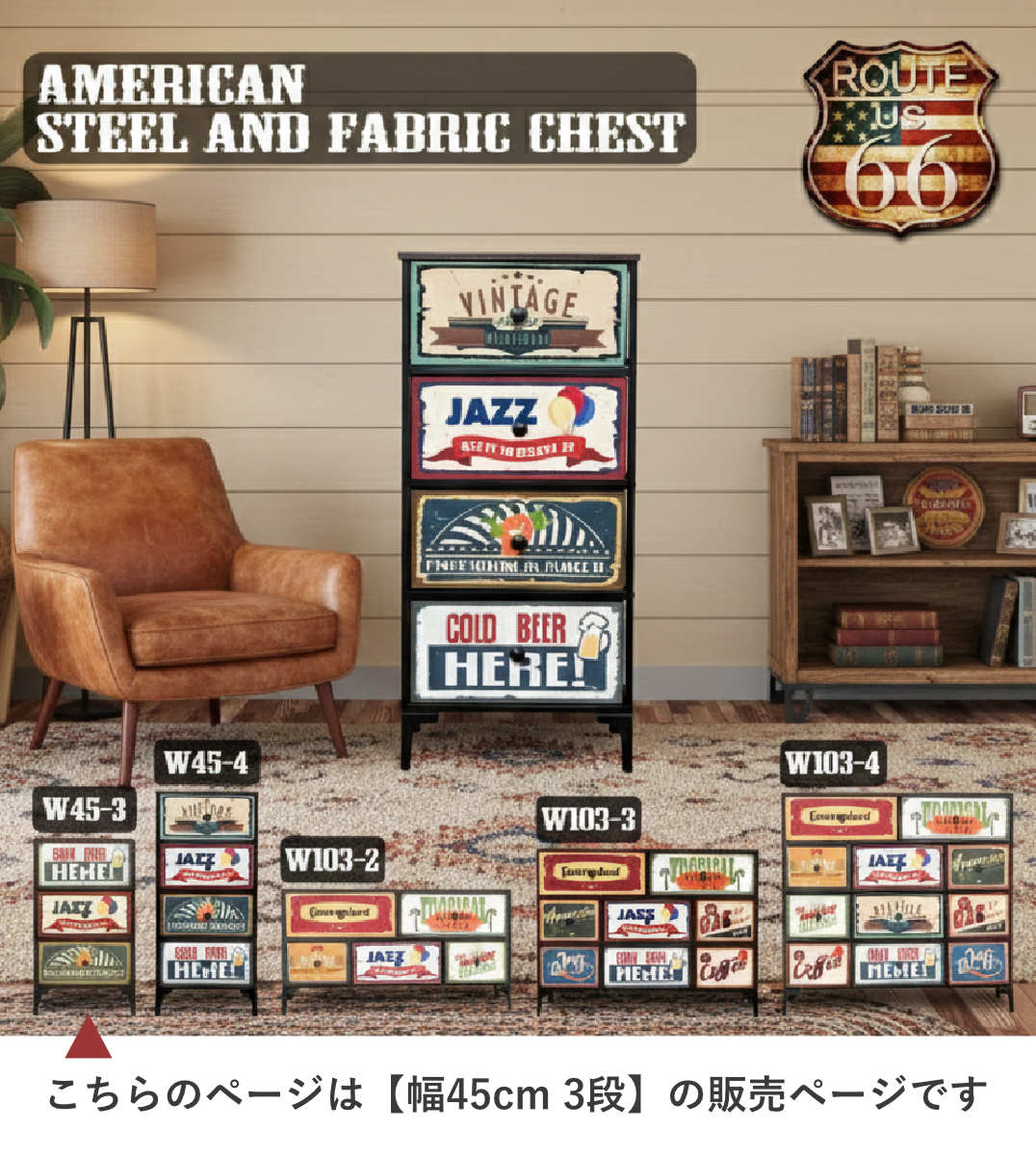 ![]() チェスト 幅45cm 3段 【▲このページの商品】 | ![]() チェスト 幅45cm 4段 | ![]() チェスト 幅103cm 5杯 |