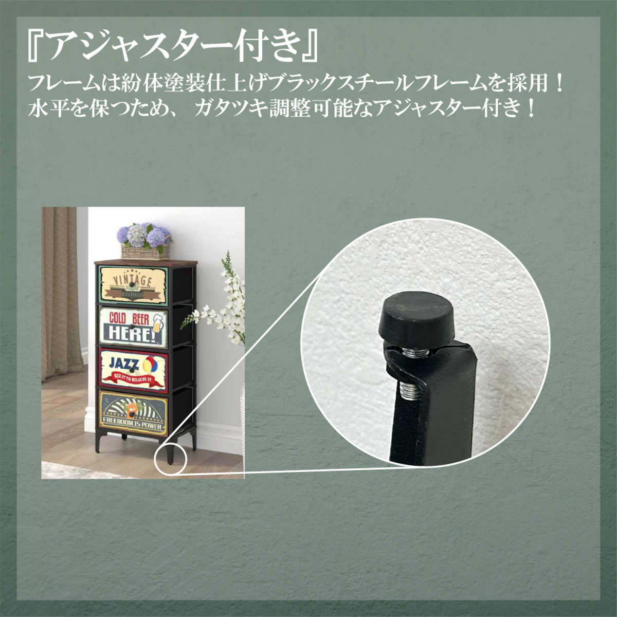 脚部にはアジャスターが付いているのでがたつきを調節することができます。