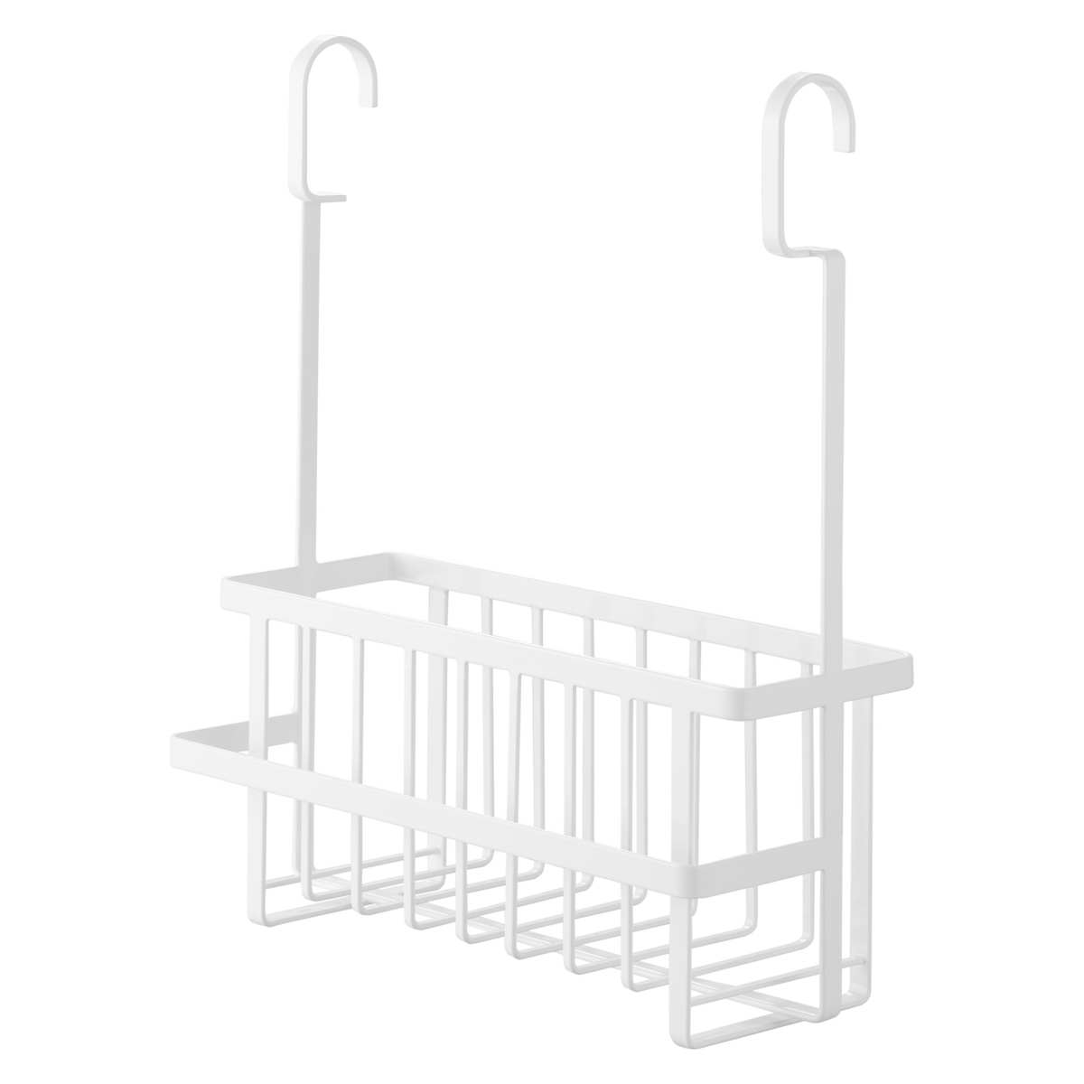ランドリーパイプに引っ掛けて、バス用品や掃除用品を浮かせて収納できる連結可能なバスケットです。ディスペンサーやチューブ類、おもちゃなどをまとめて収納でき、手前のバーにはタオルなどを掛けられます。