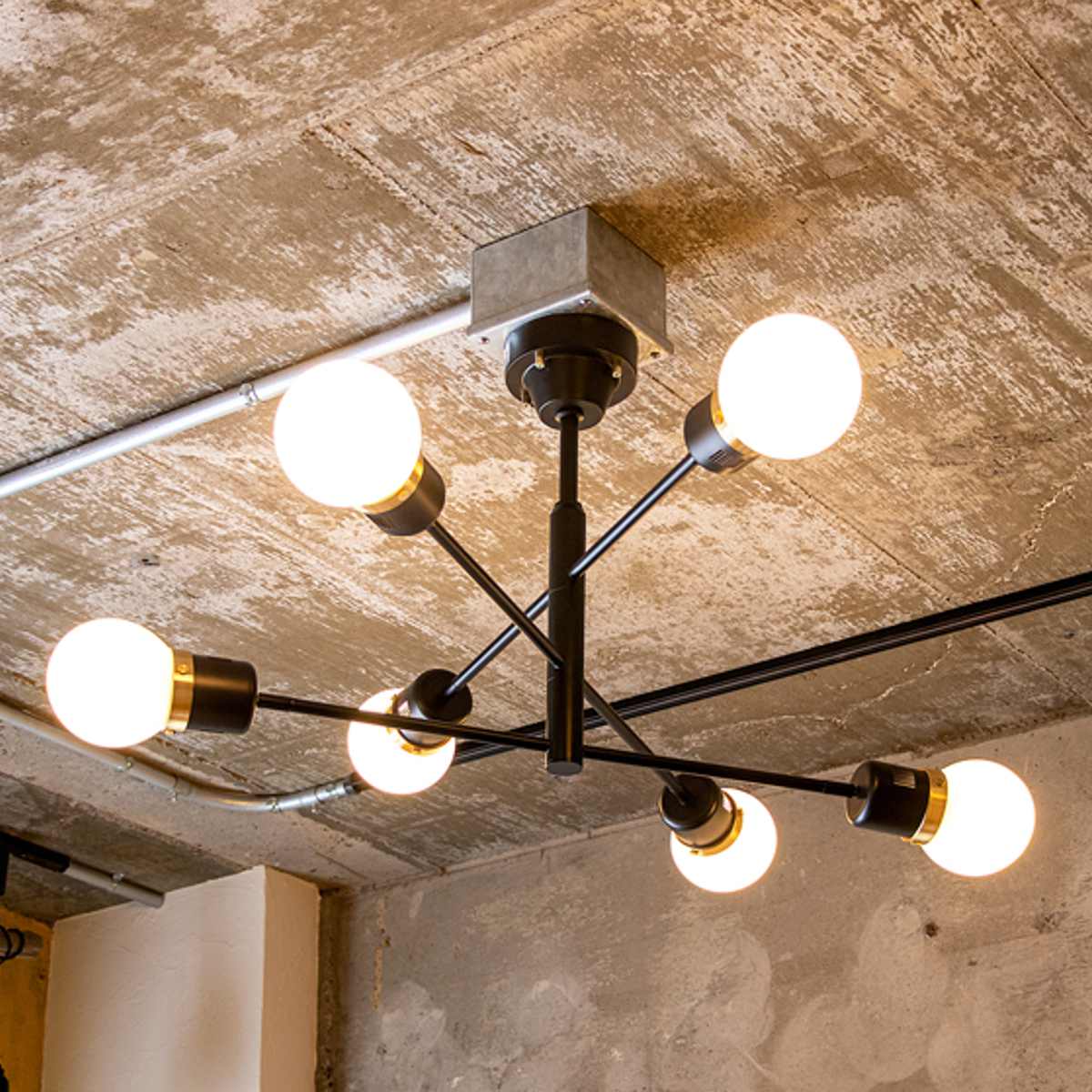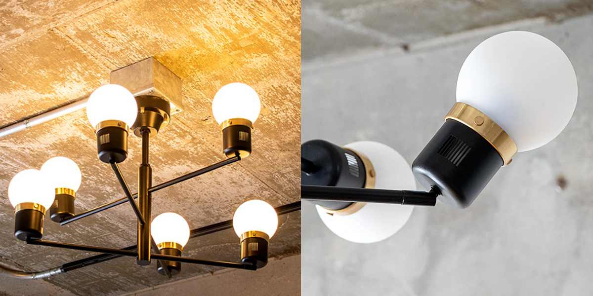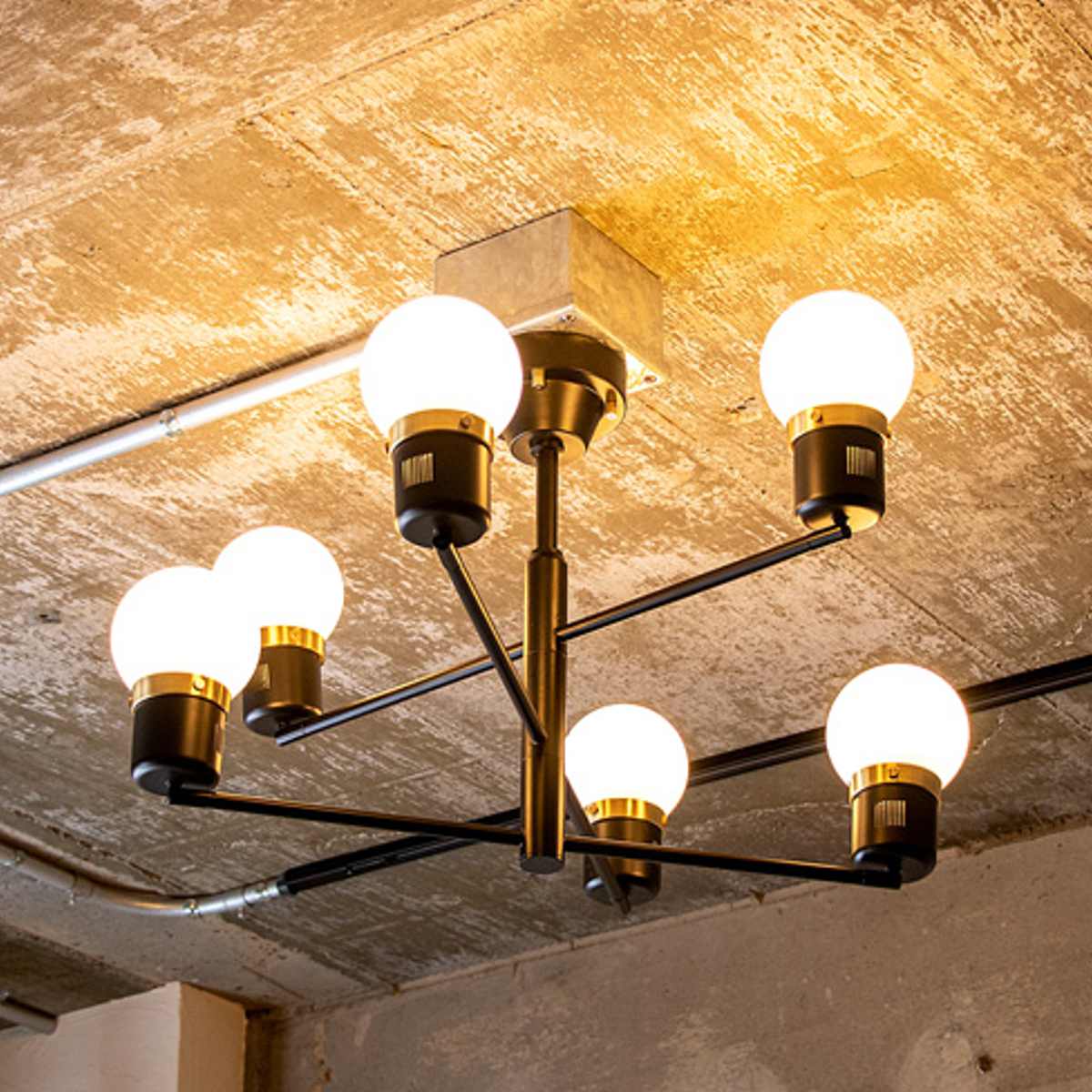 ブラック・ホワイト・ゴールドのコントラストが美しい、モダンで洗練された6灯シーリングライト。アクセントに真鍮(ゴールド)を使用し、上品で高級感のある空間を演出します。
