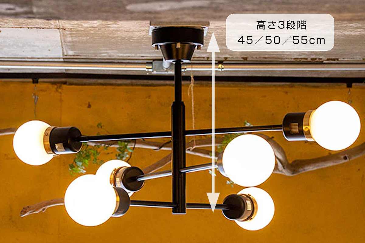 付属のパイプ(5cm・10cm・15cm)で、3段階の高さ調整が可能。天井から照明本体下までの高さは約45cm/50cm/55cmに調整できます。圧迫感を抑えながら、空間に合わせてバランスよく設置できます。