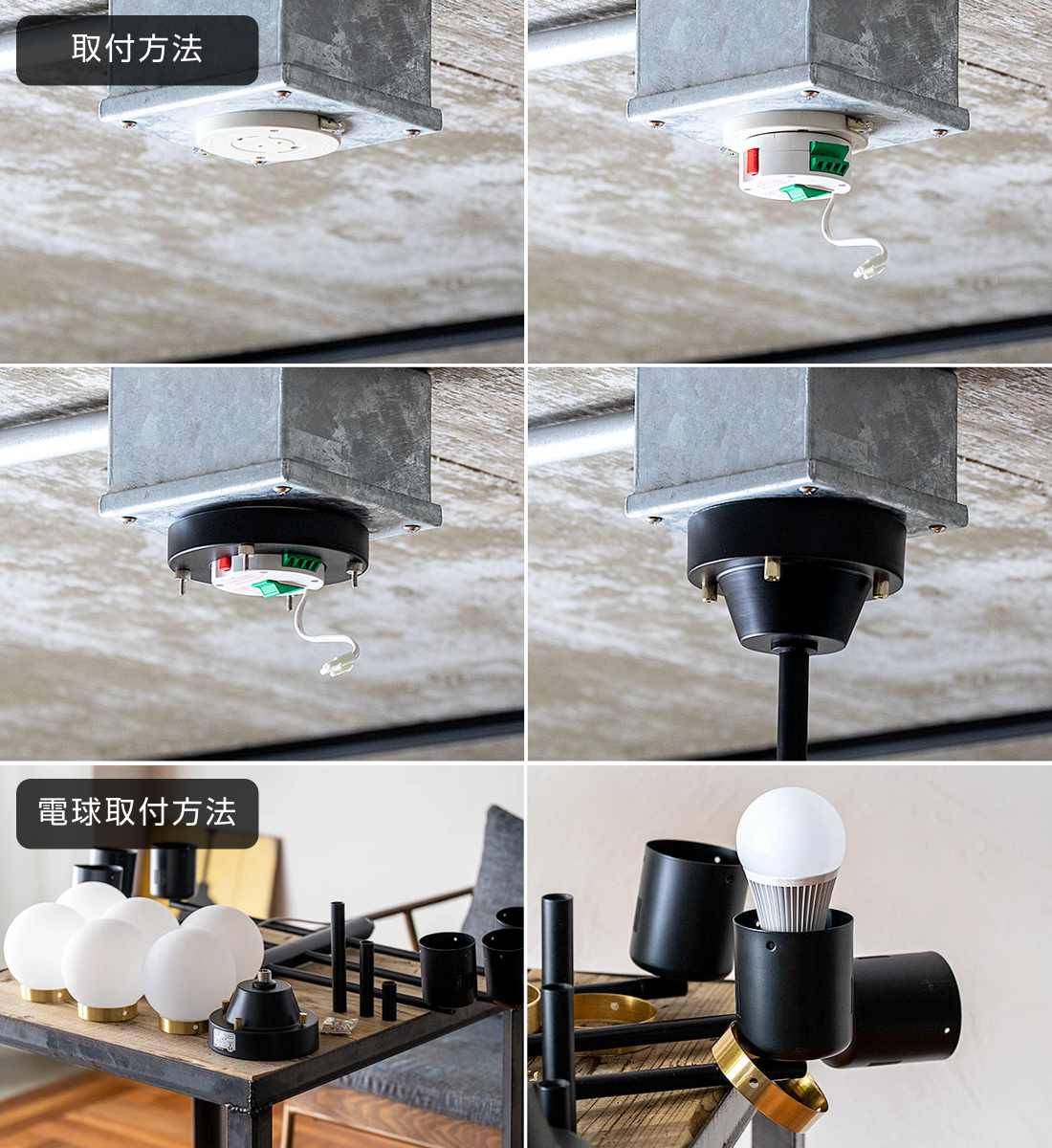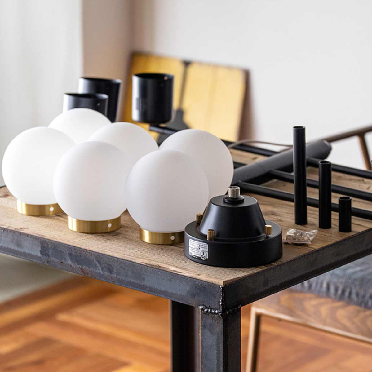 本体は組み立て式。電球をソケットに取り付け、真鍮リングをセットした後、シリコンシェードを被せてビスで固定するだけ。 手順はシンプルなので、初めての方でも安心して組み立てていただけます。