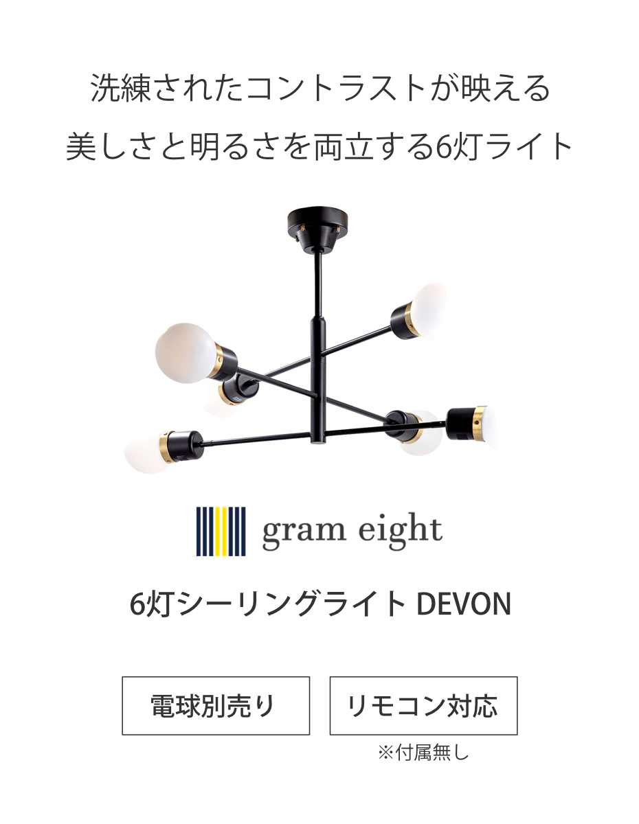 ![]() 電球なし シーリングライト 6灯 デボン 【▲このページの商品】 | ![]() 電球・リモコン付き シーリングライト 6灯 デボン |