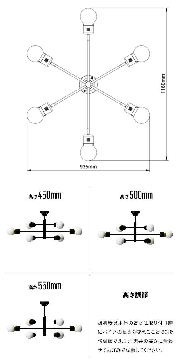 | 備考 | 【仕様】 口金:E26(電球別売) 最大ワット数:40ワット×6 ※LED電球対応 点灯方法:壁スイッチ 点灯切替:ON・OFFのみ ※メーカー保証を受けられる際は、商品に同梱されている保証書、購入日がわかるもの(領収書や納品書など)が必要になります |
