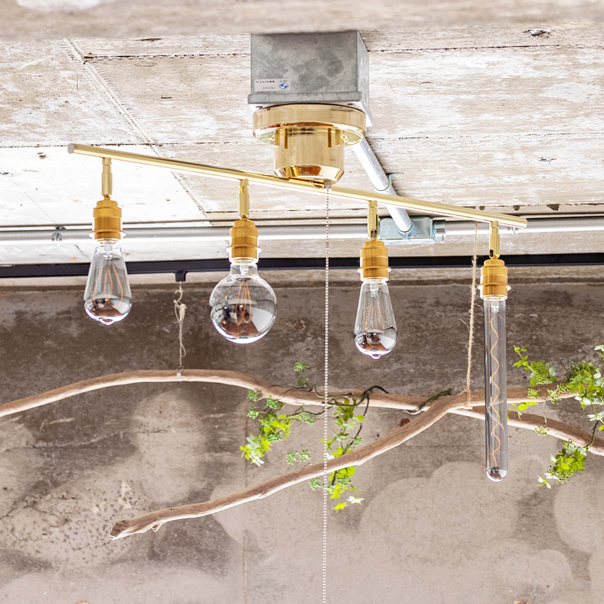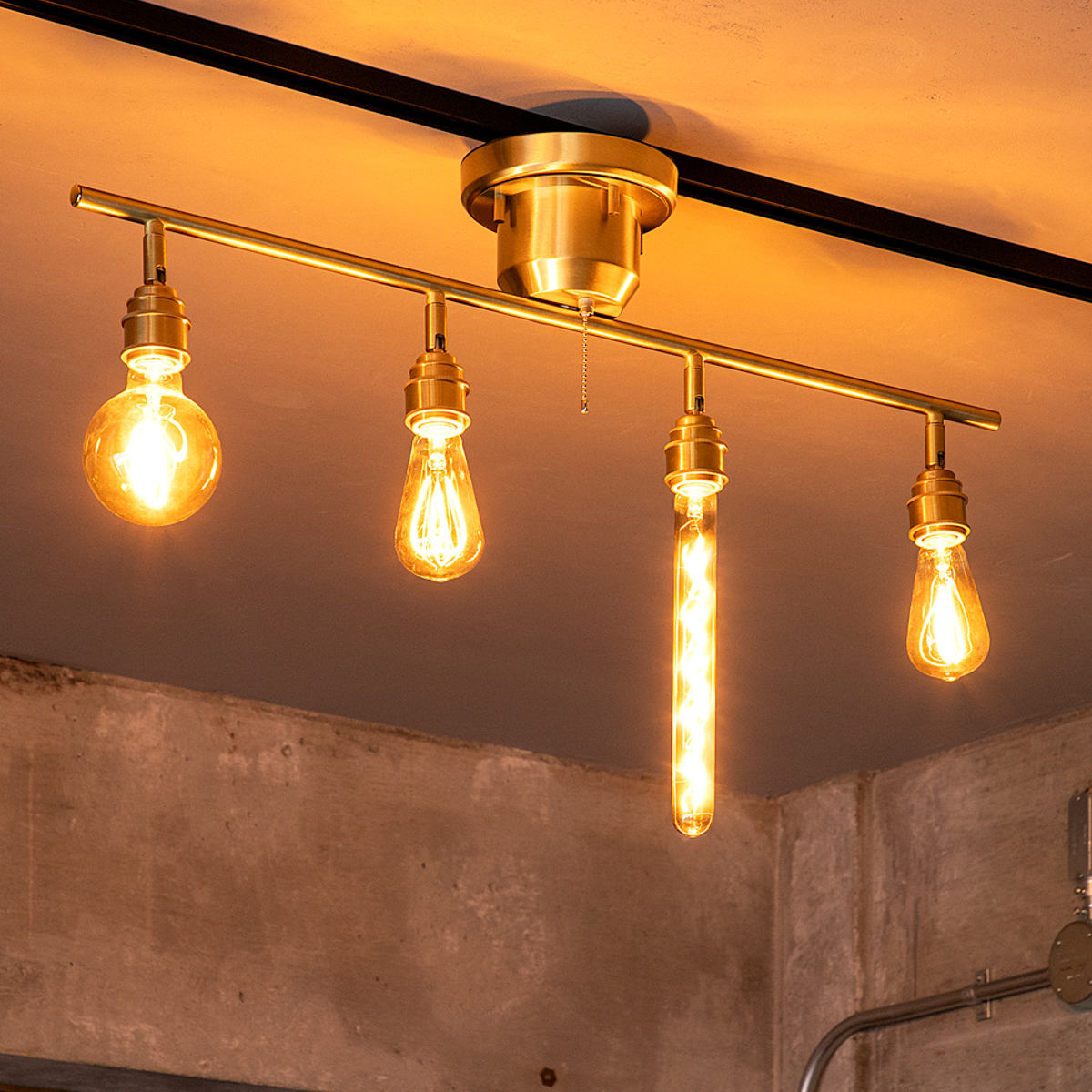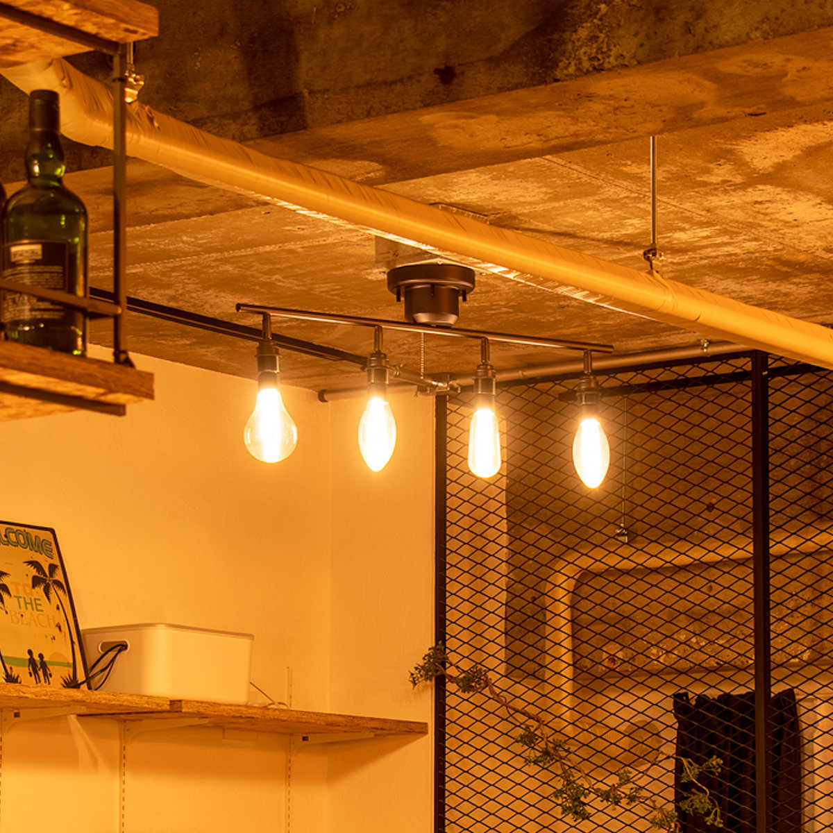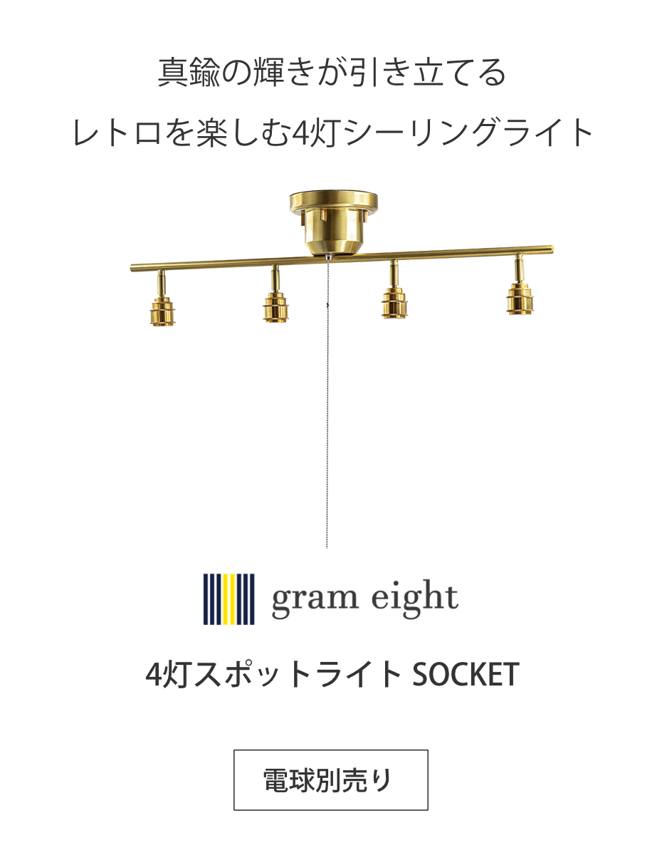 エジソン電球の魅力を最大限に活かせるシンプルな4灯シーリングライトです。同じカタチの電球を並べたり、違ったカタチの電球をバラバラにつけたり、取り付ける電球のカタチによって部屋の印象が大きく変わります。用途やインテリアに合わせて、お好きな電球でお楽しみください。