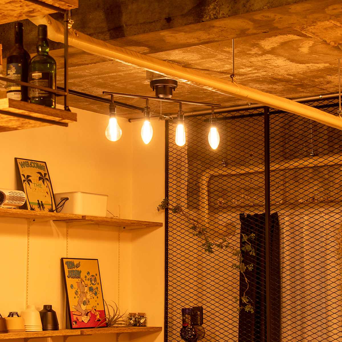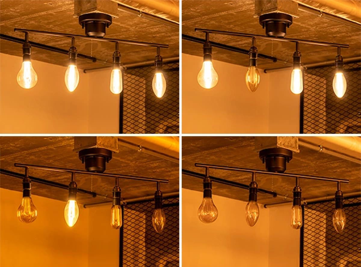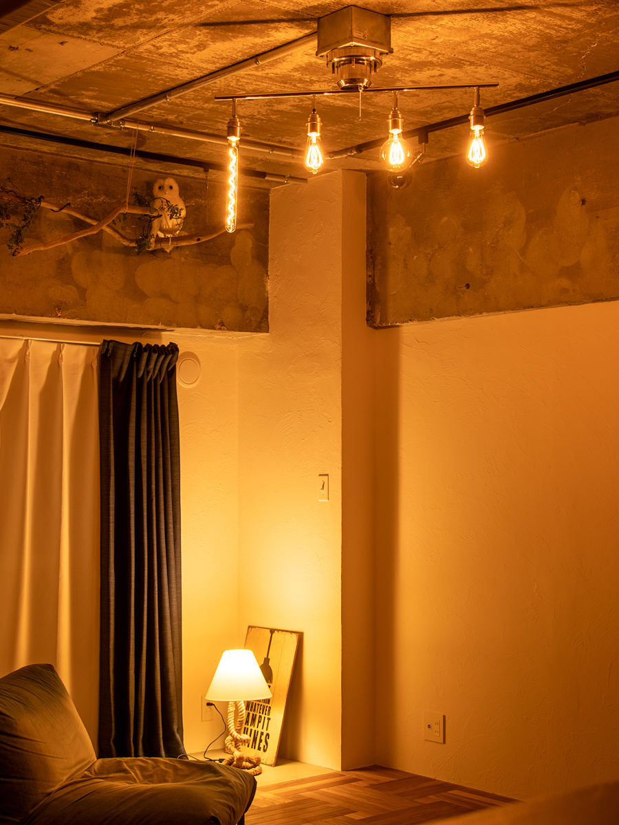 カタチの異なるエジソン電球を組み合わせて並べることで、より個性的でおしゃれな空間を演出できます。電球それぞれのフォルムやフィラメントの違いがアクセントとなり、シンプルな照明でもインテリアとしての存在感がぐっと高まります。