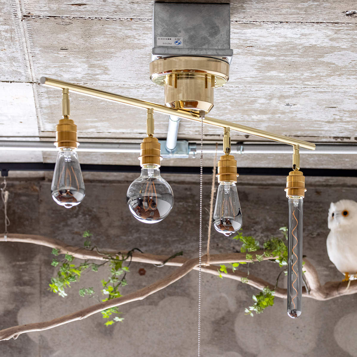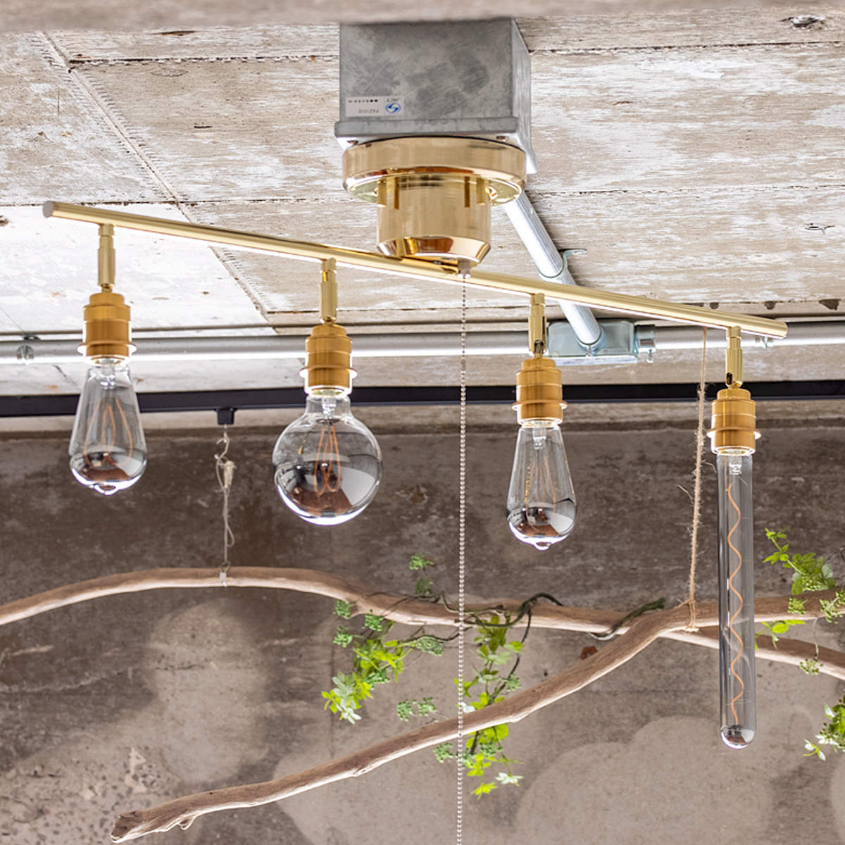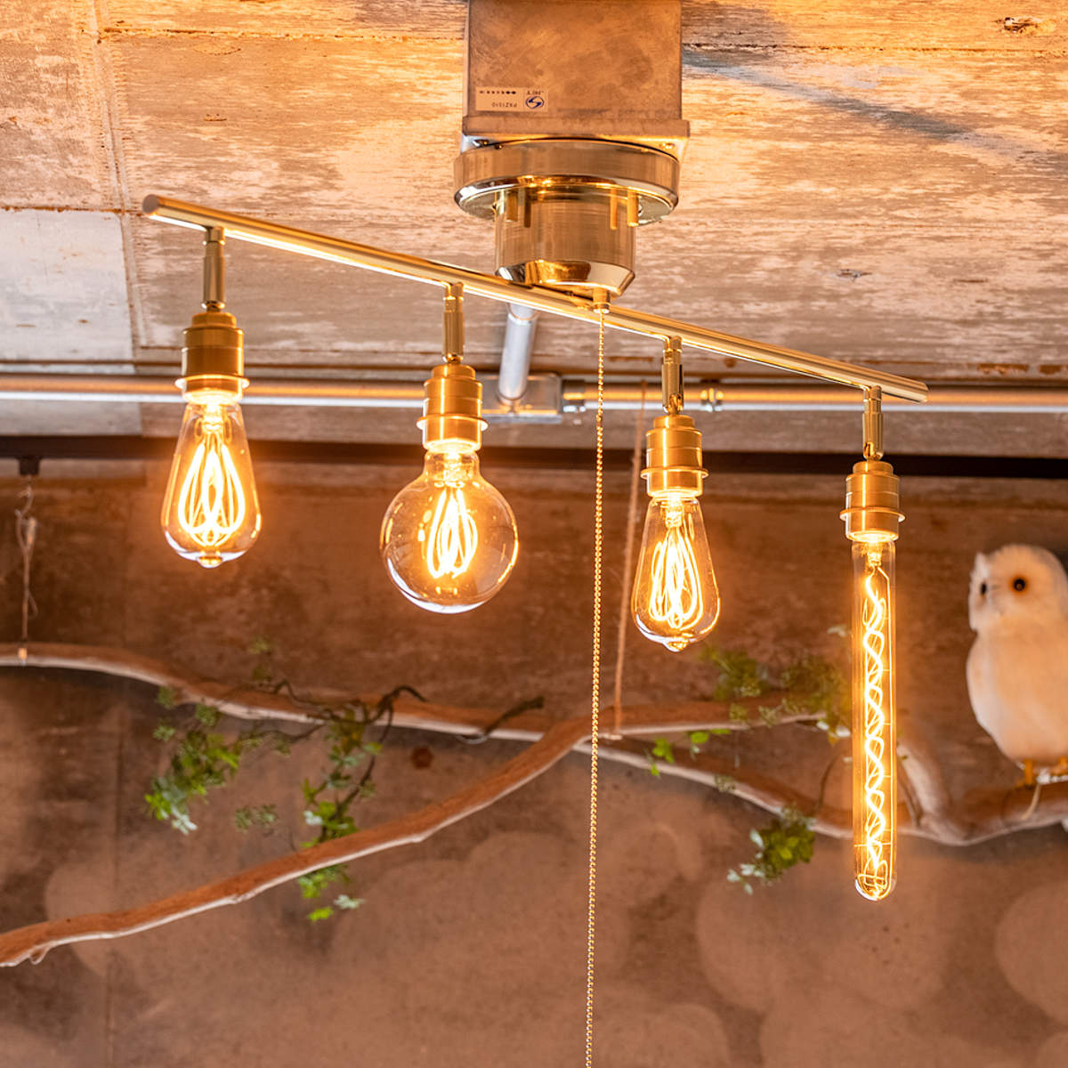 ソケット部分のカバーには真鍮を使用しています。エジソン電球のレトロな雰囲気とよく合い、全体の印象を引き立てます。天井に取り付けると目立ちにくい部分ですが、細部までしっかりこだわって仕上げています。