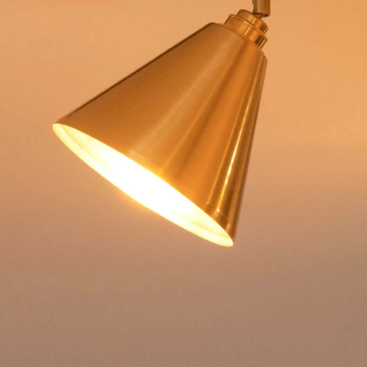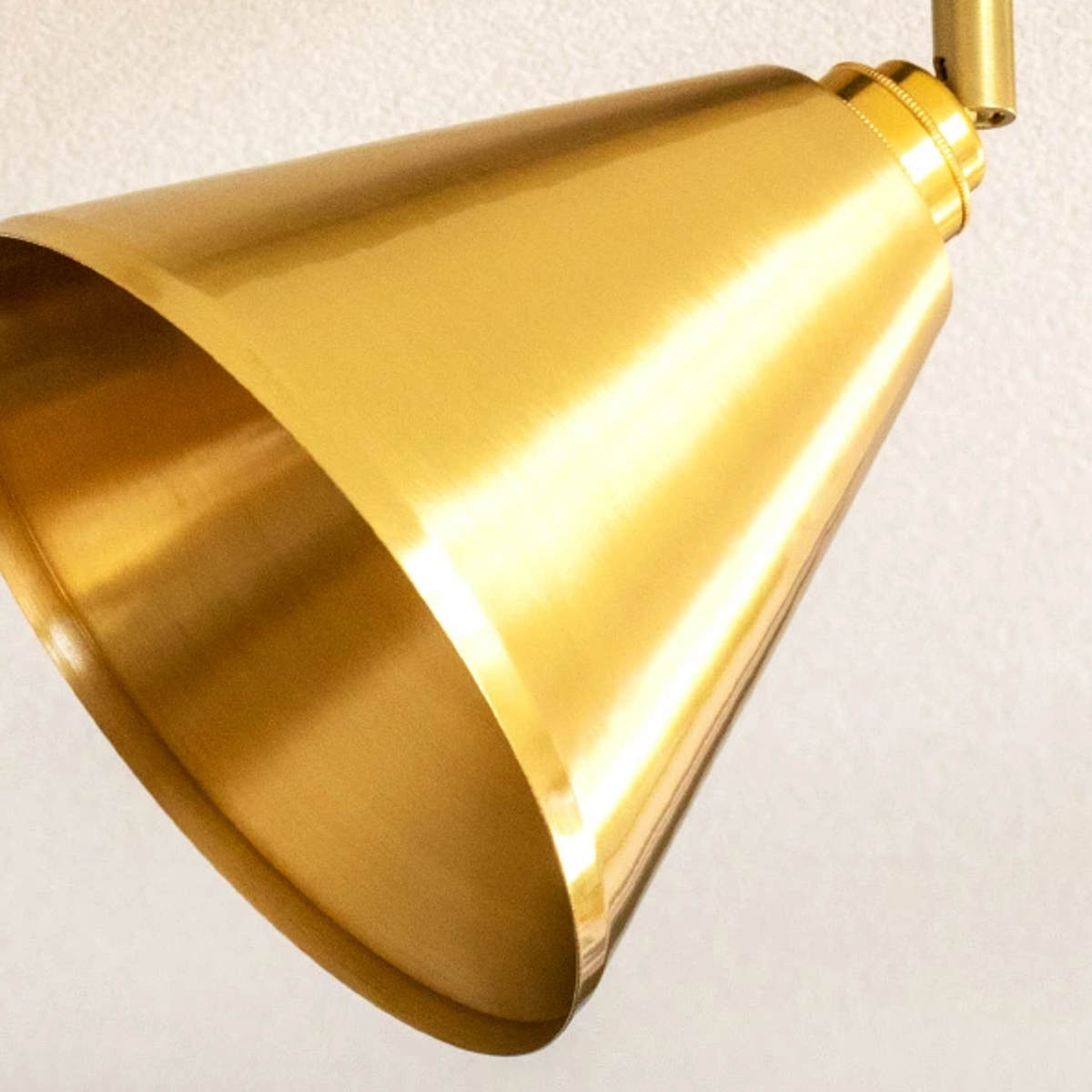 4灯それぞれの角度調整が可能で、手元や壁面など必要な場所に光を向けられます。 シェードの内側にも真鍮を使用しているため、光がやさしく反射し、あたたかみのある明るさを演出。 電球を覆う構造で、光は一方向にしっかりと広がります。