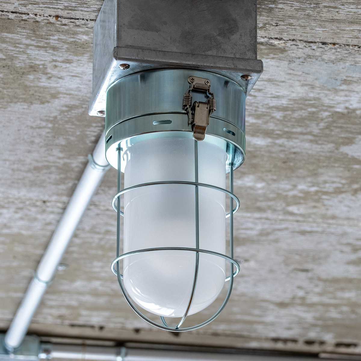 重厚感のあるシルバースチールが印象的なマリンランプ。工業系の無骨な雰囲気が空間にアクセントを加えます。