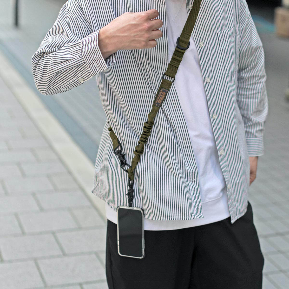 付属のストラップホルダーをスマホケースに挟み、レバー式ナスカンでショルダーストラップに接続します。肩から掛けて、必要な時にすぐスマホを取り出せます。