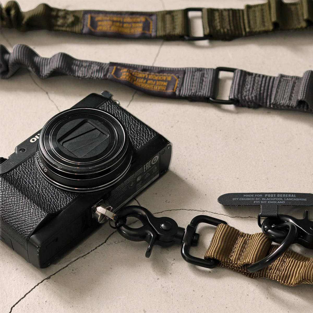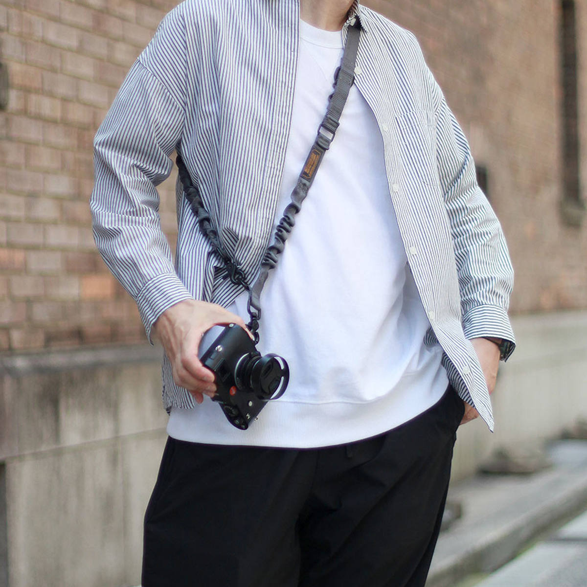 付属のカメラネジをカメラに取り付け、ナスカンとダブルリングでショルダーストラップに接続します。1点吊りで肩から掛け、カメラを持ち歩けます。使用前に必ずネジでカメラがしっかり固定されているか確認してください。