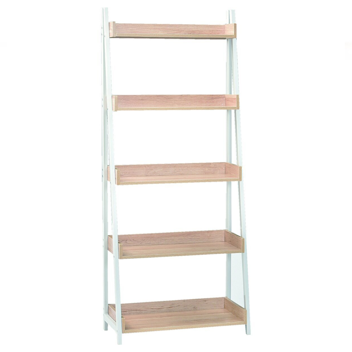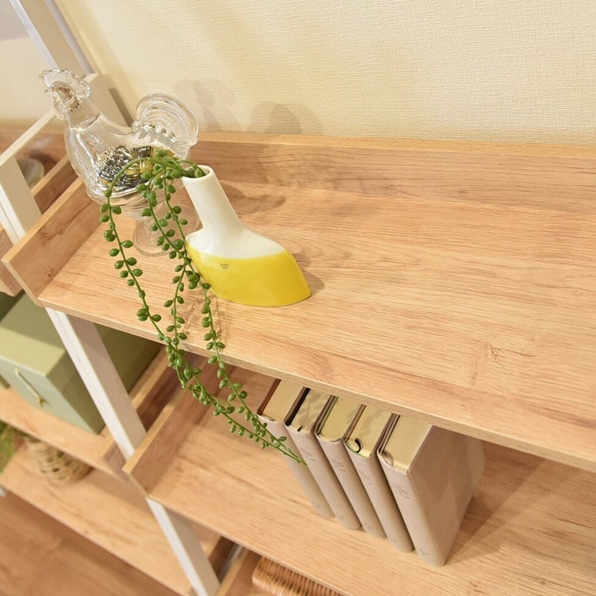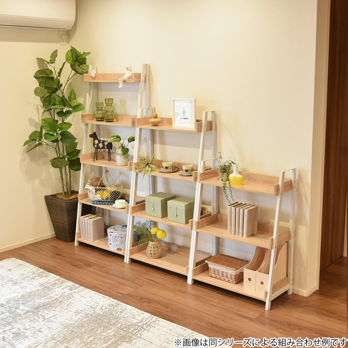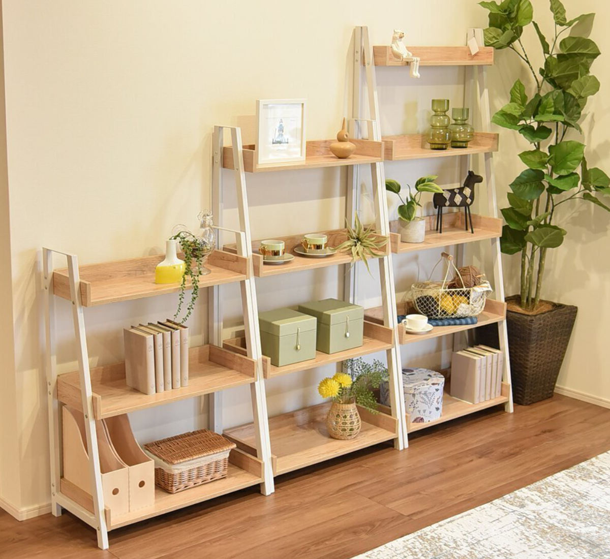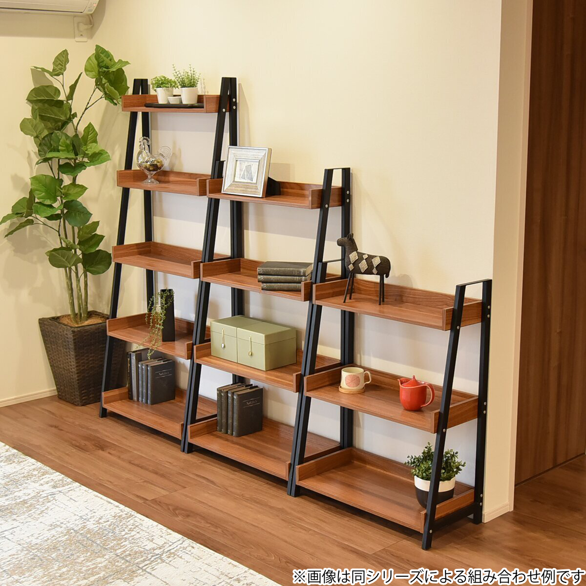 棚板の周囲に縁取りを施したデザインで、収納物が落ちにくく安心です。段ごとに異なる奥行設計により、本や雑貨、グリーンをバランスよく配置できます。