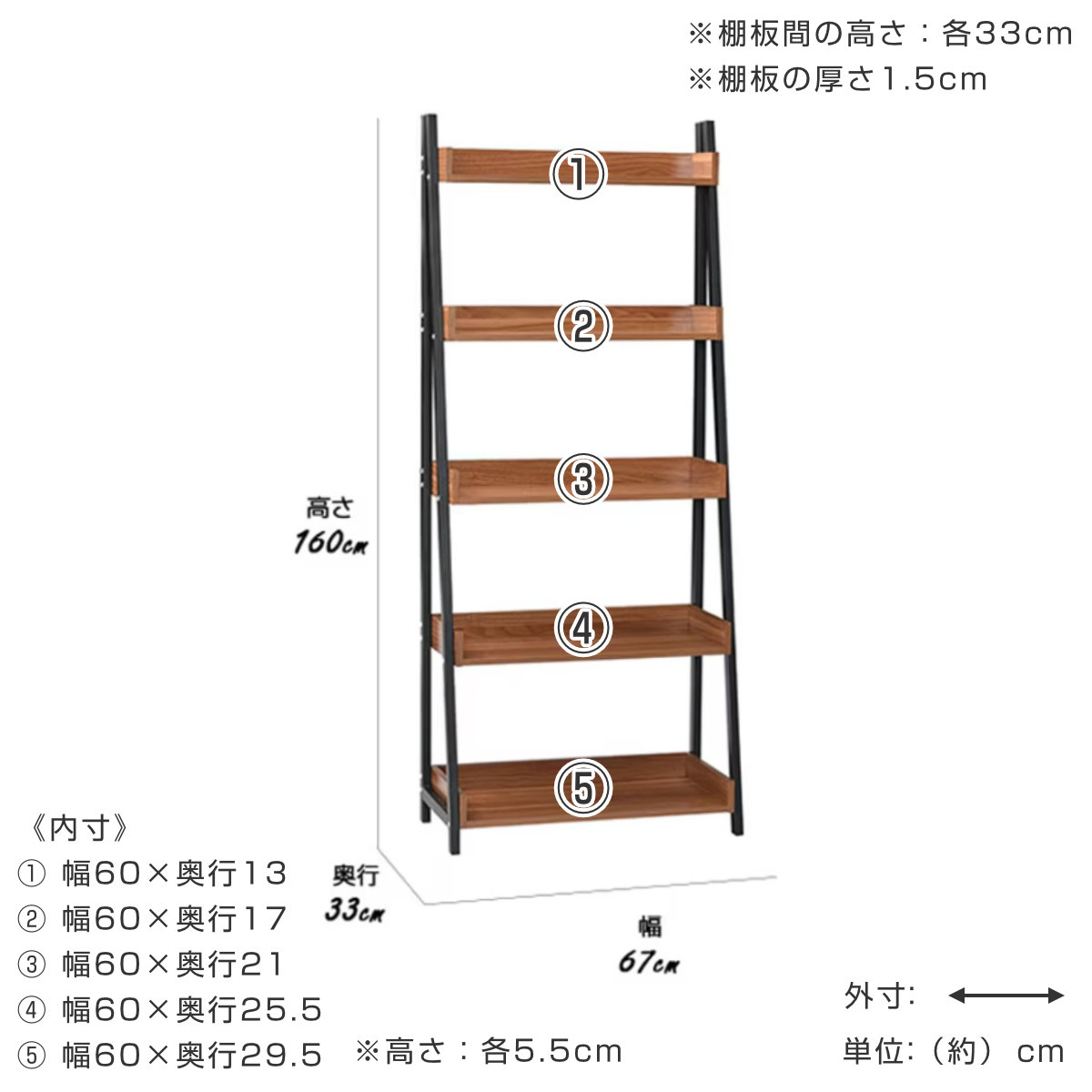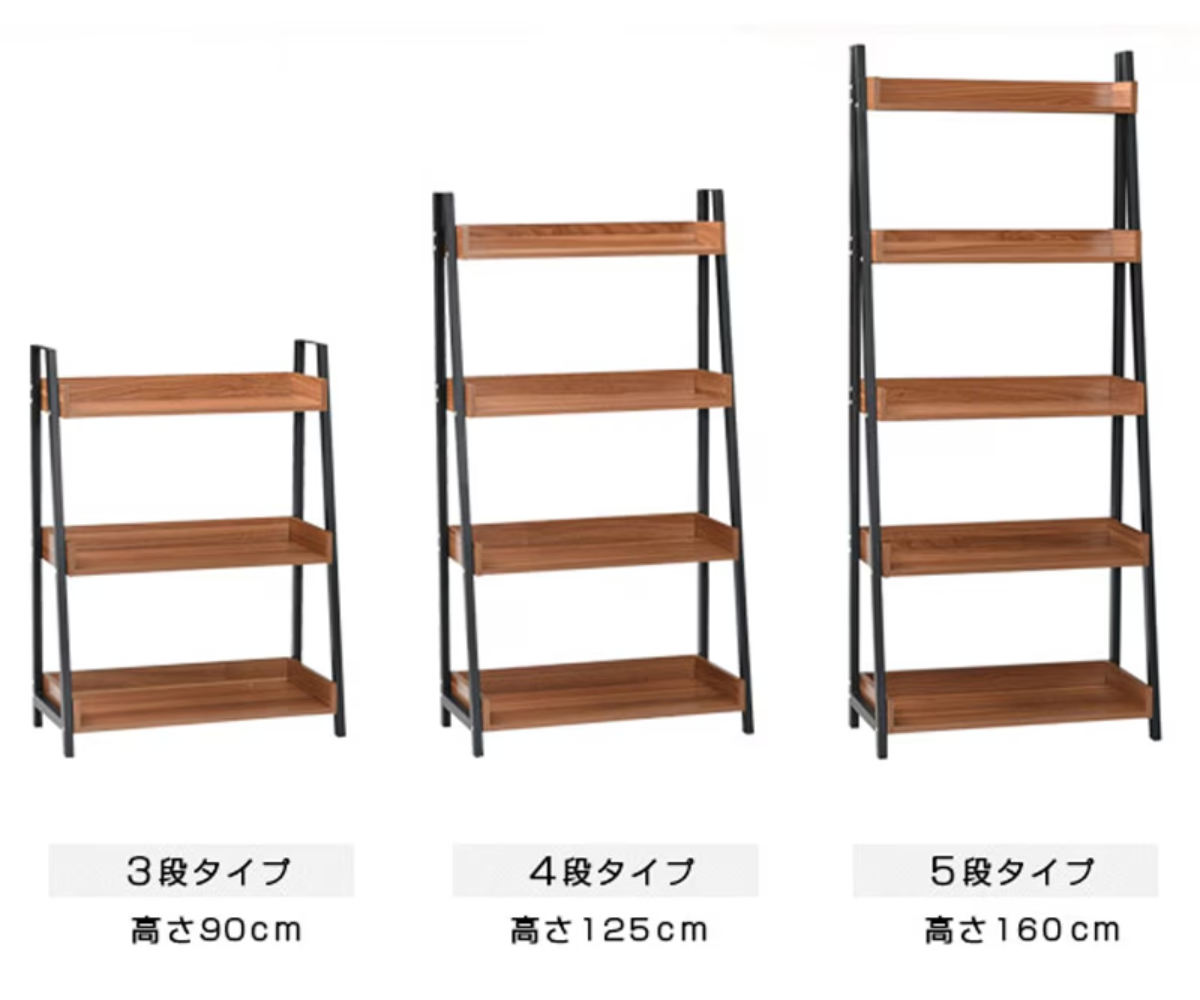 | サイズ | 約 幅67×奥行33×高さ160(cm) 棚板上から順に 1段目 幅60×奥行13×高さ5.5cm 2段目 幅60×奥行17×高さ5.5cm 3段目 幅60×奥行21×高さ5.5cm 4段目 幅60×奥行25.5×高さ5.5cm 5段目 幅60×奥行29.5×高さ5.5cm 棚板間の高さ:各33cm 棚板の厚さ1.5cm |