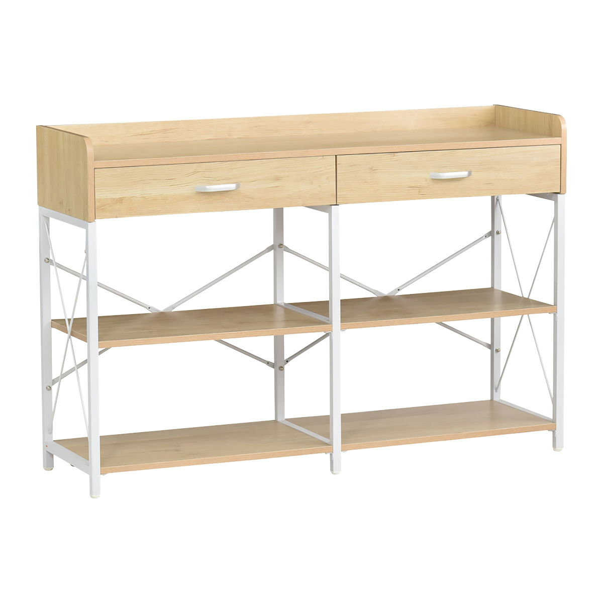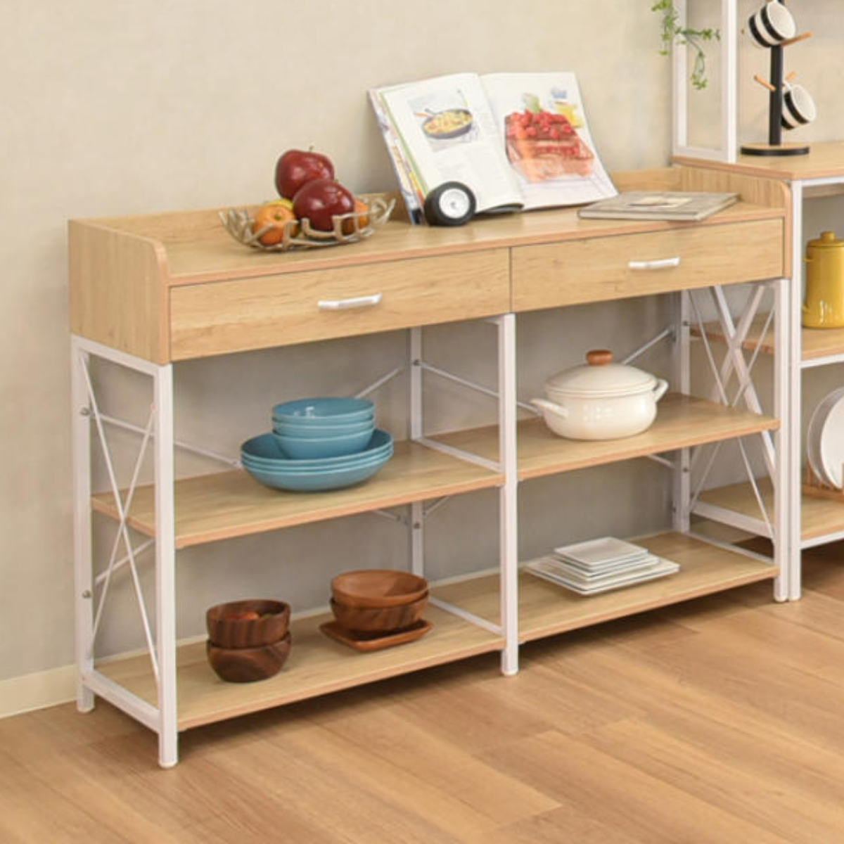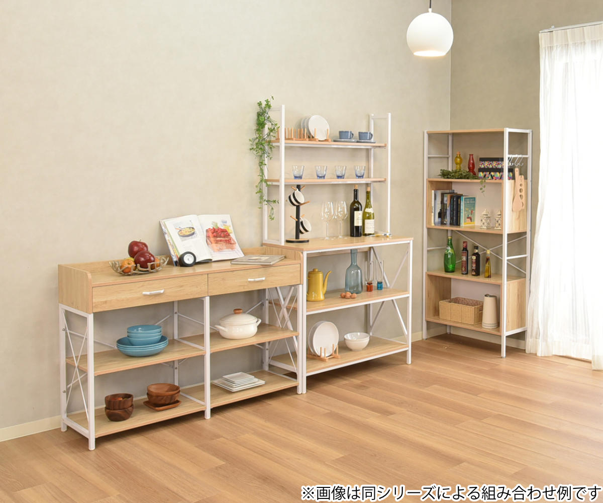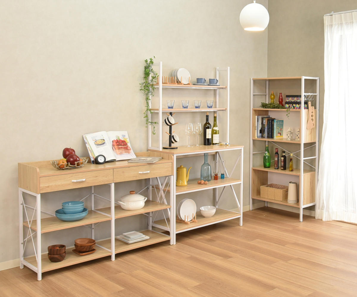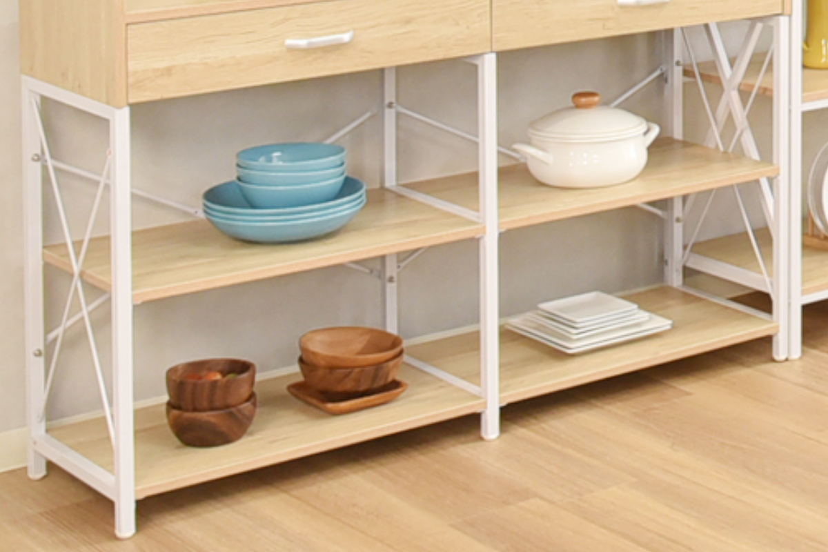 上下2段のオープン棚は、キッチンでは鍋やお皿、カトラリーを整理できる収納ラックとして使え、パソコンスペースではノートパソコンや文具を置くデスクとしても活用できます。