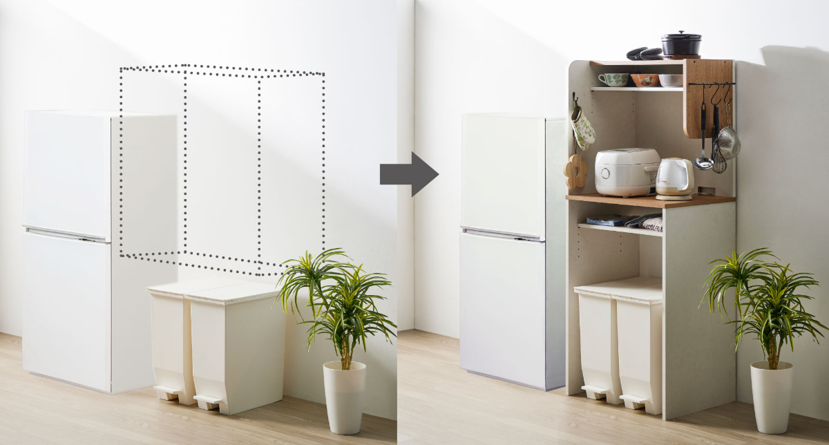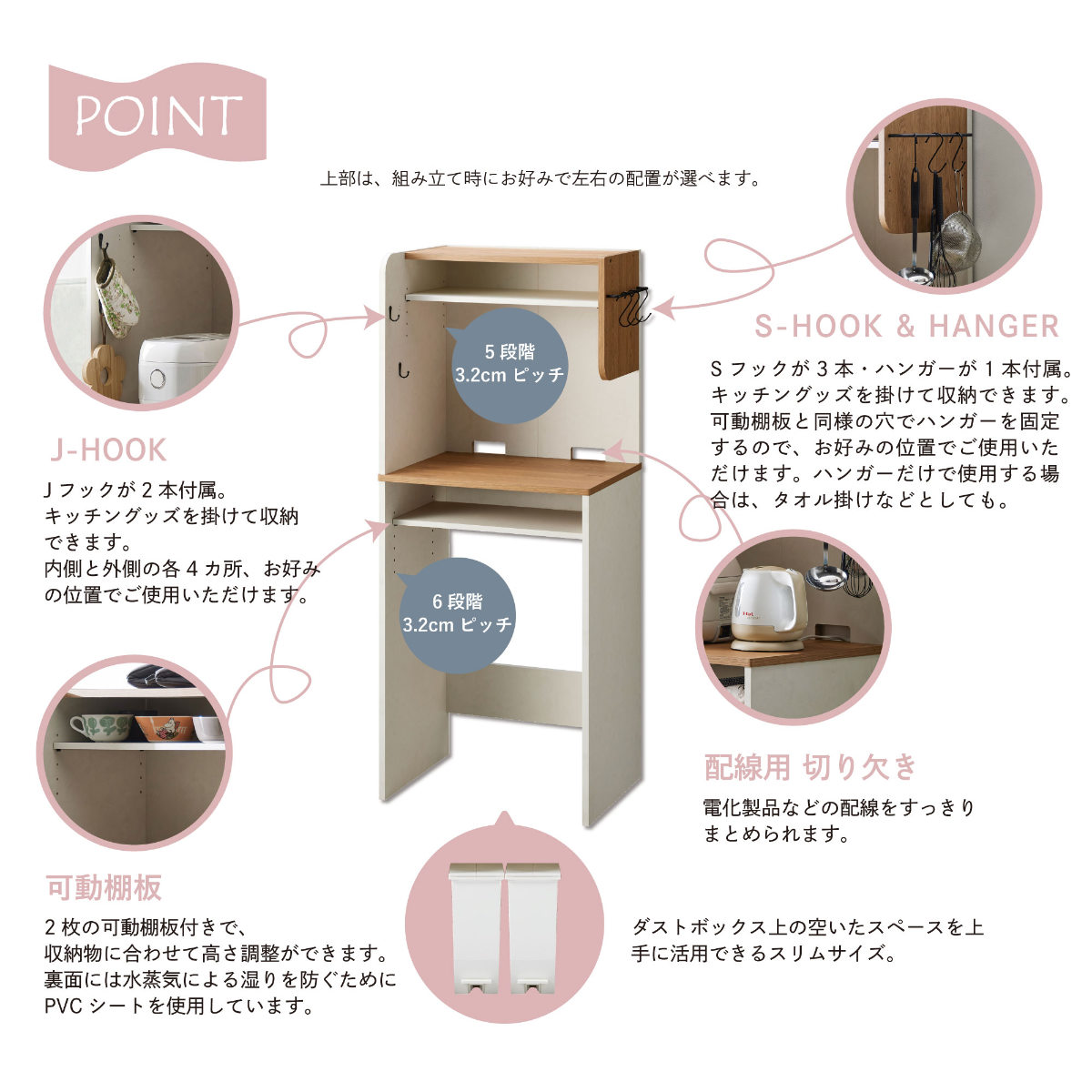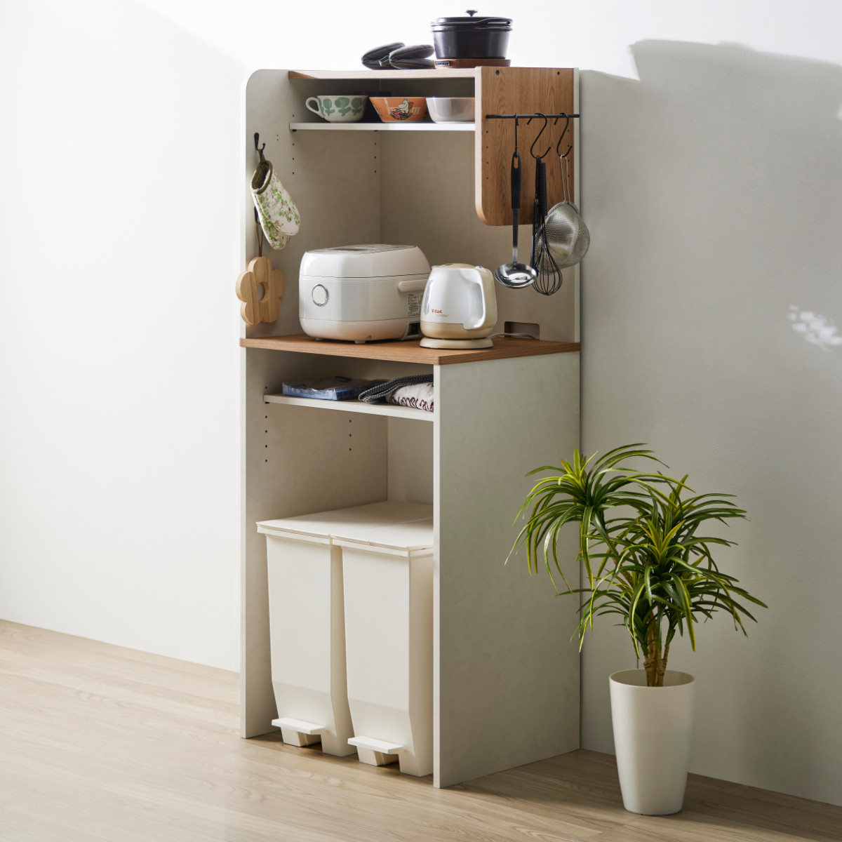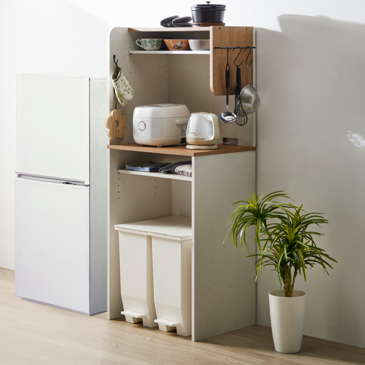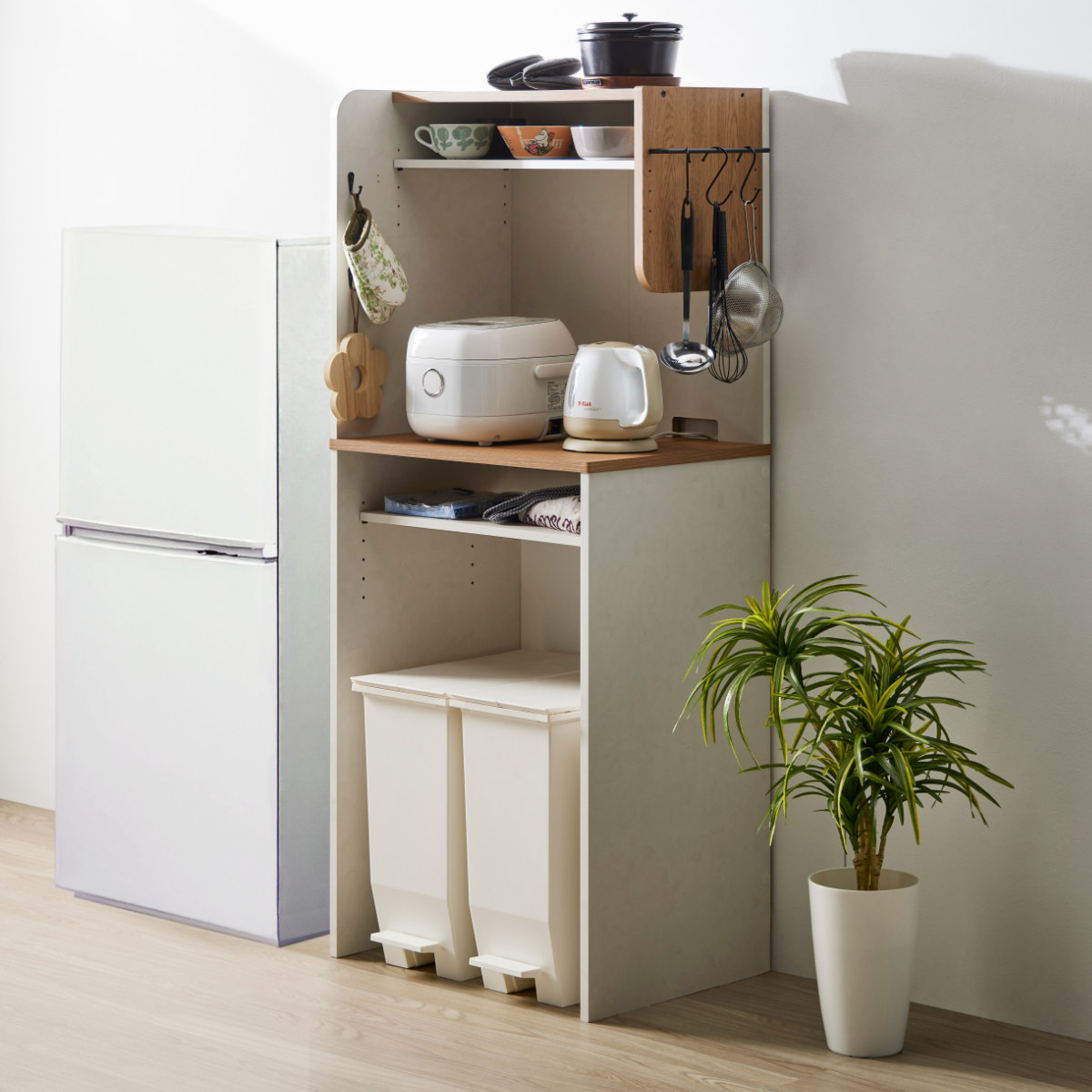デッドスペースになりがちなゴミ箱上を、収納&作業スペースとして活用できるキッチンカウンターです。ゴミ箱をすっきり収めながら、天板は調理のちょい置きや家電置きとしても使えます。下段には30Lのダストボックスが2個収納可能で、キッチン周りをすっきり整えます。