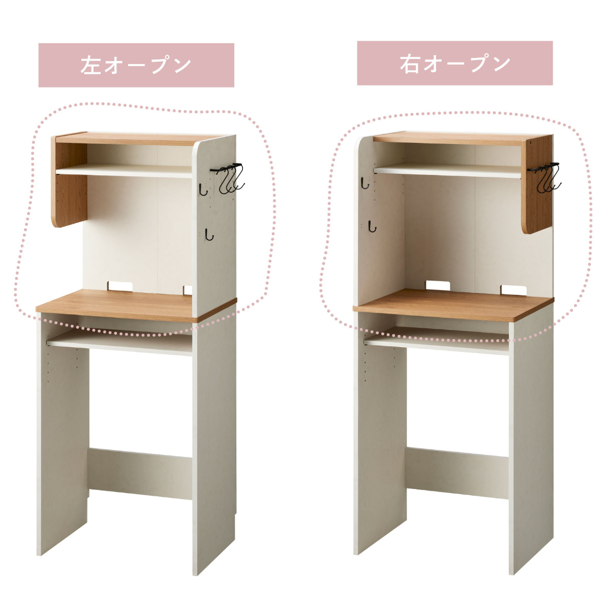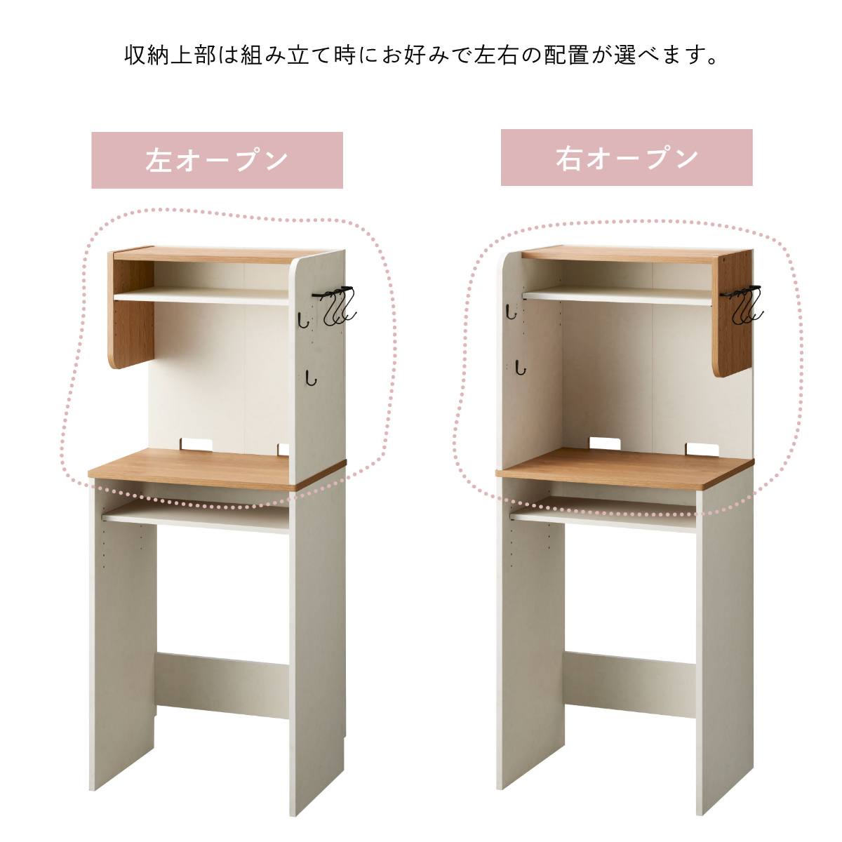 上部のオープン収納は、組み立て時に左右どちらにも設置可能。キッチンの動線や間取りに合わせて、使いやすい配置にできます。